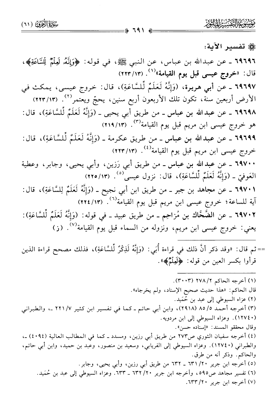 ٦٩٧٠٠ - عن عبد الله بن عباس -من طريق أبي رَزين، وأبي يحيى، وجابر، وعطية العَوفيّ- (وإنَّهُ لَعَلَمٌ لِّلسّاعَةِ)، قال: نزول عيسى (¬٥). (١٣/ ٢٢٥)