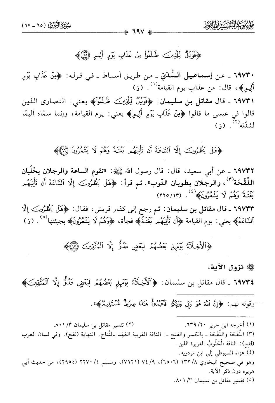 ٦٩٧٣٣ - قال مقاتل بن سليمان: ثم رجع إلى كفار قريش، فقال: {هَلْ يَنْظُرُونَ إلّا السّاعَةَ} يعني: يوم القيامة {أنْ تَأْتِيَهُمْ بَغْتَةً} فجأة، {وهُمْ لا يَشْعُرُونَ} بجيئتها (¬٥). (ز)