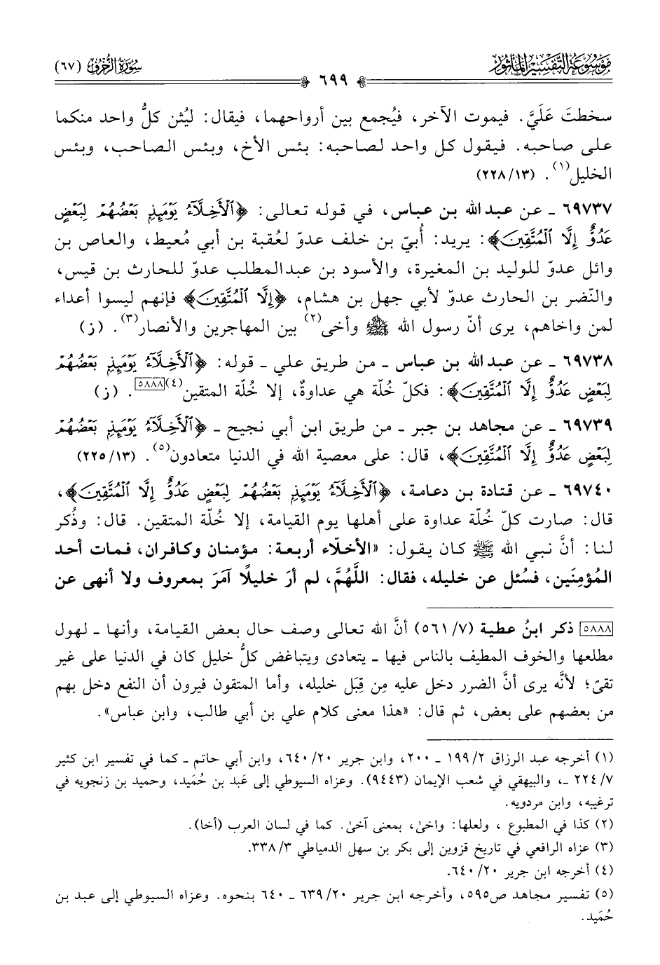 ٦٩٧٤٠ - عن قتادة بن دعامة، {الأَخِلّاءُ يَوْمَئِذٍ بَعْضُهُمْ لِبَعْضٍ عَدُوٌّ إلّا المُتَّقِينَ}، قال: صارت كلّ خُلّة عداوة على أهلها يوم القيامة، إلا خُلّة المتقين. قال: وذُكر لنا: أنّ نبي الله - صلى الله عليه وسلم - كان يقول: «الأخلّاء أربعة: مؤمنان وكافران، فمات أحد المُؤمِنَين، فسُئل عن خليله، فقال: اللهم، لم أرَ خليلًا آمَرَ بمعروف ولا أنهى عن