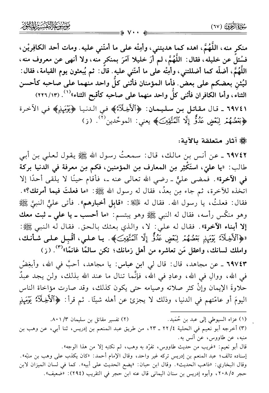 ٦٩٧٤٣ - عن مجاهد، قال: قال لي ابن عباس: يا مجاهد، أحبَّ في الله، وأبغِضْ في الله، ووالِ في الله، وعادِ في الله، فإنّما تنال ما عند الله بذلك، ولن يجد عبدٌ حلاوةَ الإيمان وإنْ كثر صلاته وصيامه حتى يكون كذلك، وقد صارت مؤاخاة الناس اليومَ أو عامّتهم في الدنيا، وذلك لا يجزئ عن أهله شيئًا. ثم قرأ: {الأخلاء يومئذ