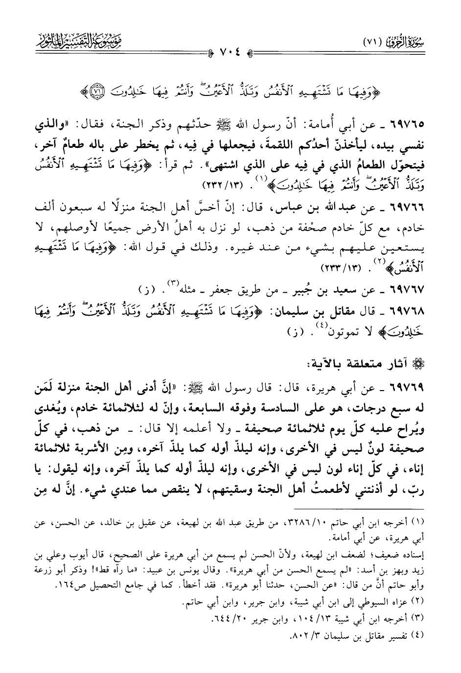 ٦٩٧٦٦ - عن عبد الله بن عباس، قال: إنّ أخسَّ أهل الجنة منزلًا له سبعون ألف خادم، مع كلّ خادم صحْفة من ذهب، لو نزل به أهلُ الأرض جميعًا لأوصلهم، لا يستعين عليهم بشيء من عند غيره. وذلك في قول الله: {وفِيها ما تَشْتَهِيهِ الأَنْفُسُ} (¬٢). (١٣/ ٢٣٢)