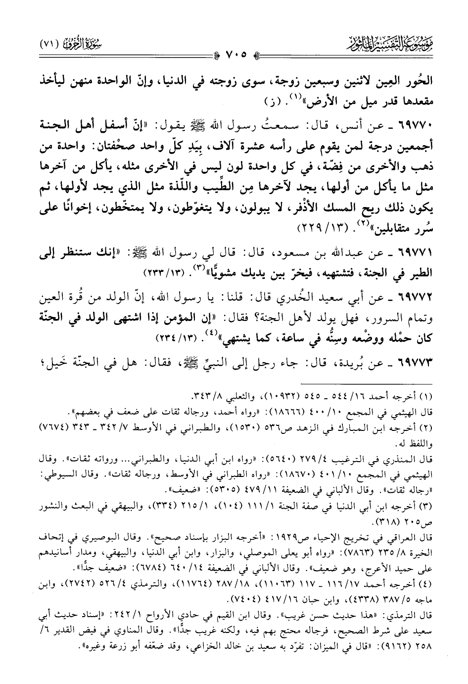 ٦٩٧٧١ - عن عبد الله بن مسعود، قال: قال لي رسول الله - صلى الله عليه وسلم -: «إنك ستنظر إلى الطير في الجنة، فتشتهيه، فيخرّ بين يديك مشويًّا» (¬٣). (١٣/ ٢٣٣)