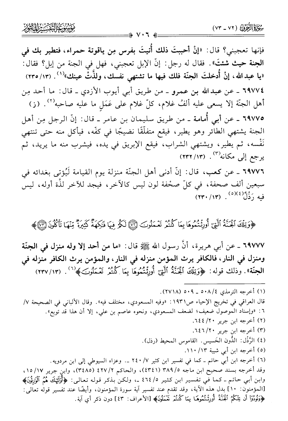 ٦٩٧٧٧ - عن أبي هريرة، أنّ رسول الله - صلى الله عليه وسلم - قال: «ما من أحد إلا وله منزل في الجنّة ومنزل في النار، فالكافر يرث المؤمن منزله في النار، والمؤمن يرث الكافر منزله في الجنّة». وذلك قوله: {وتِلْكَ الجَنَّةُ الَّتِي أُورِثْتُمُوها بِما كُنْتُمْ تَعْمَلُونَ} (¬٦). (١٣/ ٢٣٧)