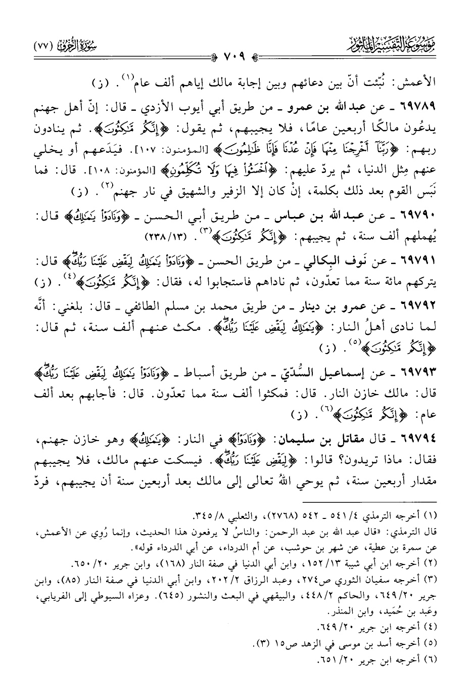 ٦٩٧٩٢ - عن عمرو بن دينار -من طريق محمد بن مسلم الطائفي- قال: بلغني: أنّه لما نادى أهلُ النار: {يا مالك ليقض علينا ربك}. مكث عنهم ألف سنة، ثم قال: {إنكم ماكثون} (¬٥). (ز)