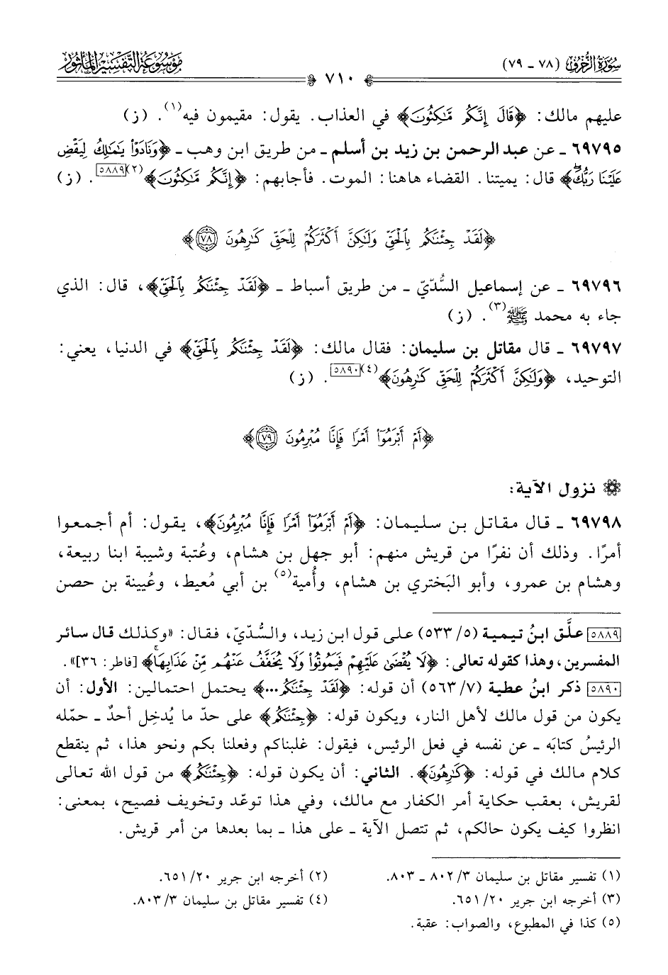 [٥٨٩٠] ذكر ابن عطية (٧/ ٥٦٣) أن قوله: {لَقَدْ جِئْناكُمْ ... } يحتمل احتمالين: الأول: أن يكون من قول مالك لأهل النار، ويكون قوله: {جِئْناكُمْ} على حدّ ما يُدخِل أحدٌ -حمّله الرئيسُ كتابَه- عن نفسه في فعل الرئيس، فيقول: غلبناكم وفعلنا بكم ونحو هذا، ثم ينقطع كلام مالك في قوله: {كارِهُونَ}. الثاني: أن يكون قوله: {جِئْناكُمْ} من قول الله تعالى لقريش، بعقب حكاية أمر الكفار مع مالك، وفي هذا توعّد وتخويف فصيح، بمعنى: انظروا كيف يكون حالكم، ثم تتصل الآية -على هذا- بما بعدها من أمر قريش.
