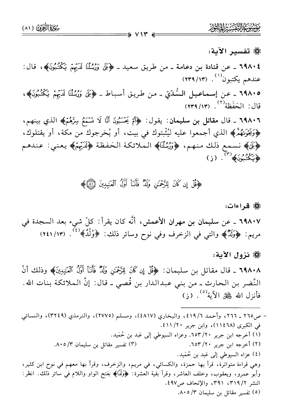 ٦٩٨٠٨ - قال مقاتل بن سليمان: {قُلْ إنْ كانَ لِلرَّحْمَنِ ولَدٌ فَأَنا أوَّلُ العابِدِينَ} وذلك أنّ النَّضر بن الحارث -من بني عبد الدار بن قُصي- قال: إنّ الملائكة بنات الله. فأنزل الله - عز وجل - الآية (¬٥). (ز)