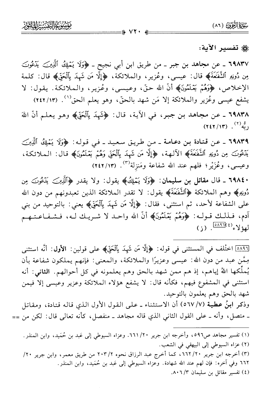 ٦٩٨٣٧ - عن مجاهد بن جبر -من طريق ابن أبي نجيح- {ولا يَمْلِكُ الَّذِينَ يَدْعُونَ مِن دُونِهِ الشَّفاعَةَ} قال: عيسى، وعُزير، والملائكة، {إلّا مَن شَهِدَ بِالحَقِّ} قال: كلمة الإخلاص، {وهُمْ يَعْلَمُونَ} أنّ الله حقّ، وعيسى، وعُزير، والملائكة. يقول: لا يشفع عيسى وعُزير والملائكة إلا مَن شهد بالحقّ، وهو يعلم الحق (¬١). (١٣/ ٢٤٢)