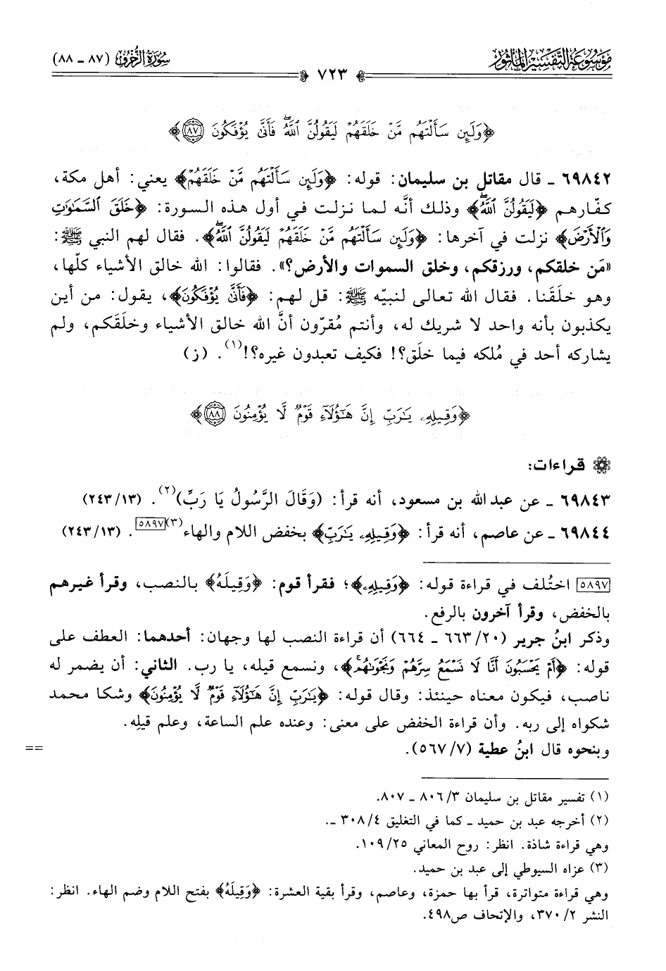[٥٨٩٧] (أ) اختُلف في قراءة قوله: {وقيله}؛ فقرأ قوم: «وقِيلَهُ» بالنصب، وقرأ غيرهم بالخفض، وقرأ آخرون بالرفع.