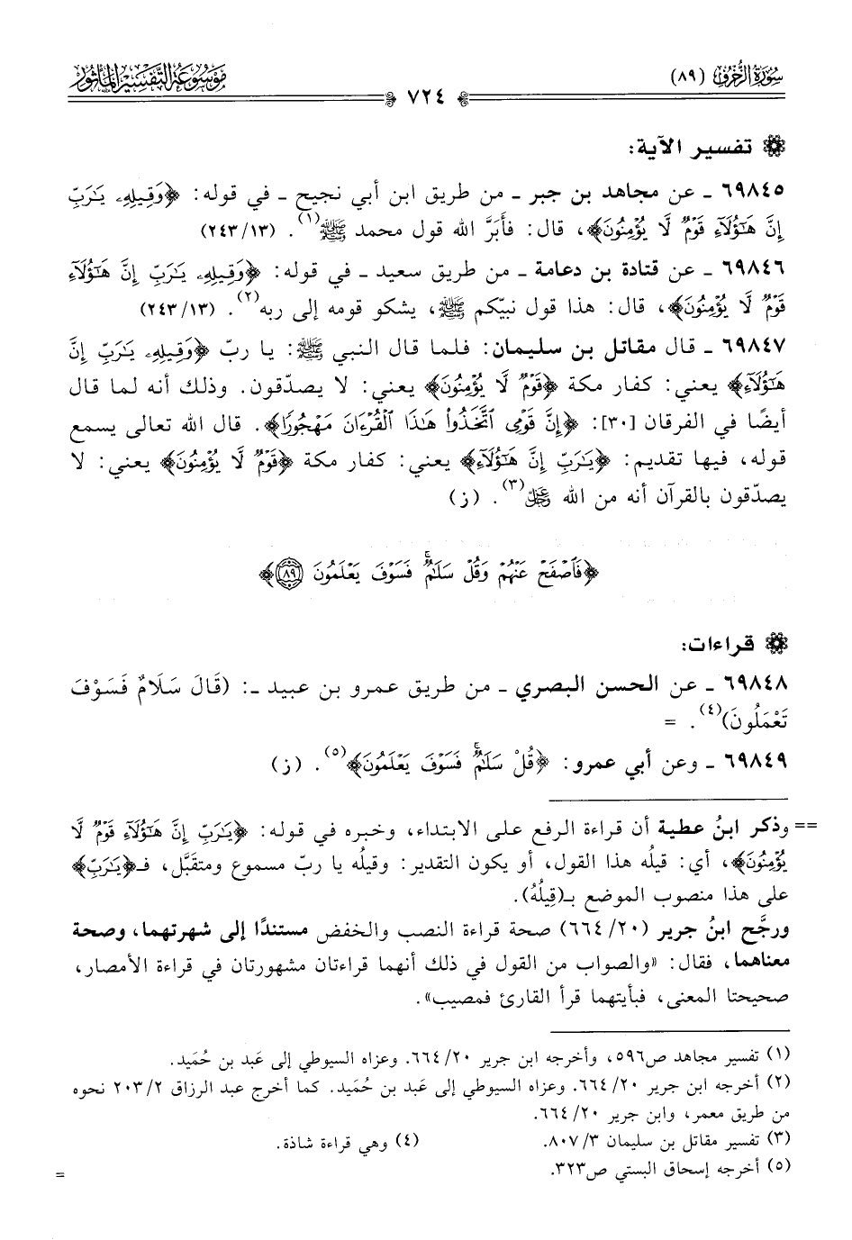 ٦٩٨٤٥ - عن مجاهد بن جبر -من طريق ابن أبي نجيح- في قوله: {وقِيلِهِ يا رَبِّ إنَّ هَؤُلاءِ قَوْمٌ لا يُؤْمِنُونَ}، قال: فأَبَرَّ الله قول محمد - صلى الله عليه وسلم - (¬١). (١٣/ ٢٤٣)