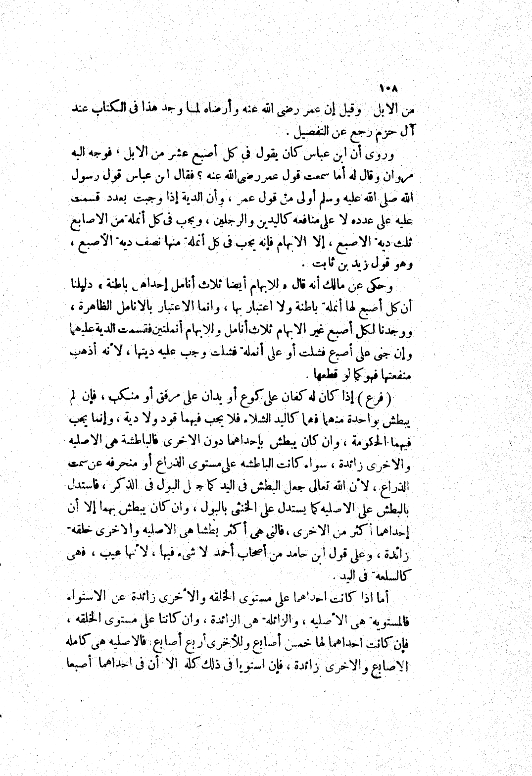وروى أن ابن عباس كان يقول في كل أصبع عشر من الابل، فوجه إليه مروان وقال له أما سمعت قول عمر رضى الله عنه؟ فقال ابن عباس قَوْلُ رَسُولِ اللَّهِ صَلَّى اللَّهُ عَلَيْهِ وَسَلَّمَ أولى من قول عمر، وأن الدية إذا وجبت بعدد قسمت عليه على عدده لا على منافعه كاليدين والرجلين، ويجب في كل أنملة من الاصابع ثلث دية الاصبع، إلا الابهام فإنه يجب في كل أنملة منها نصف دية الاصبع، وهو قول زيد بن ثابت.