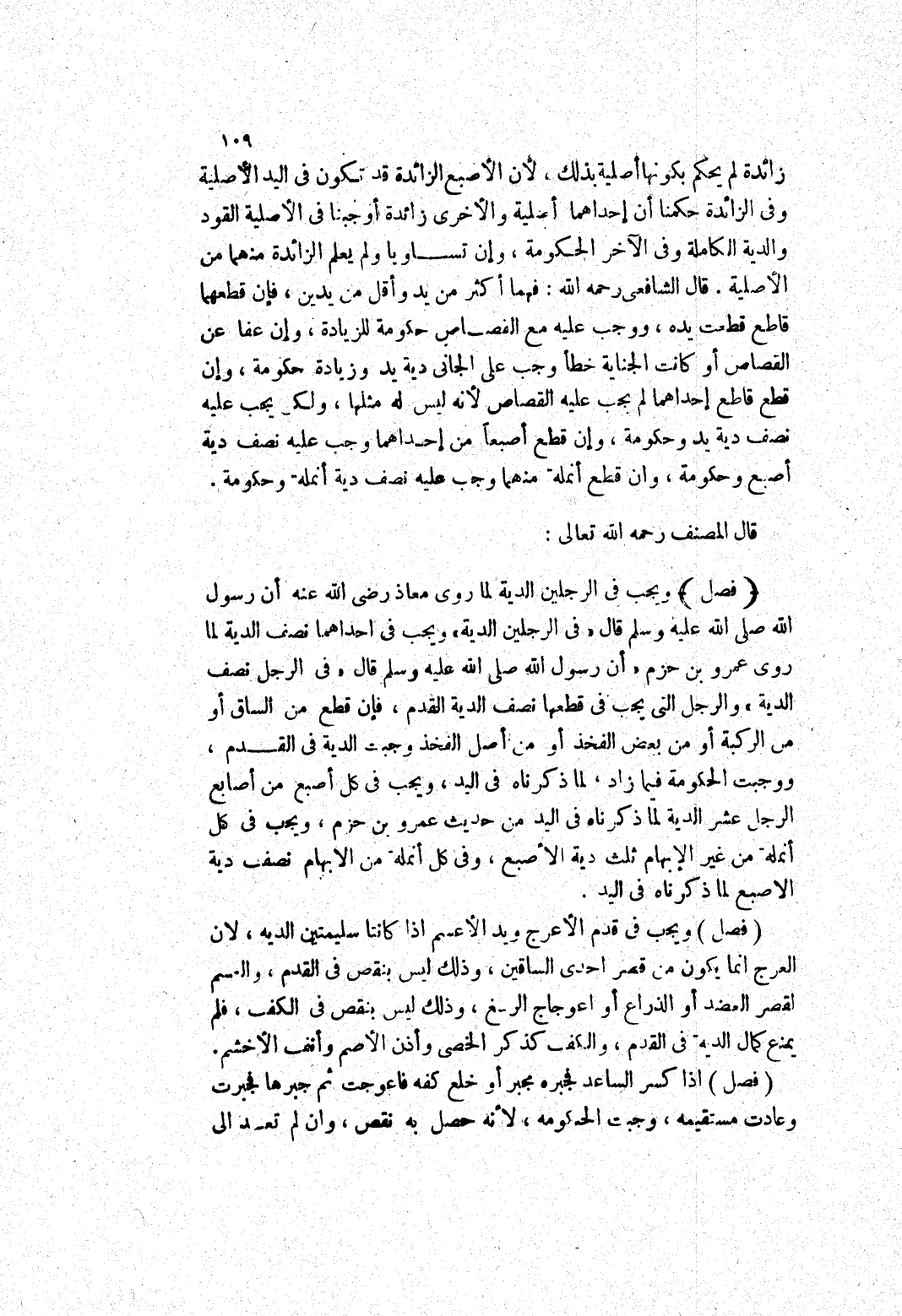 ويجب في الرجلين الدية لِمَا رَوَى مُعَاذٌ رَضِيَ اللَّهُ عَنْهُ أَنَّ رَسُولِ اللَّهِ صَلَّى اللَّهُ عَلَيْهِ وَسَلَّمَ قَالَ (في الرجلين الدية) ويجب في احداهما نصف الدية لما روى عمرو بن حزم (أَنَّ رَسُولَ اللَّهِ صَلَّى اللَّهُ عَلَيْهِ وَسَلَّمَ قال (في الرجل نصف الدية) والرجل التى يجب في قطعها نصف الدية القدم، فإن قطع من الساق أو من الركبة أو من بعض الفخذ من أصل الفخذ وجبت الدية في القدم، ووجبت الحكومة فيما زاد، لما ذكرناه في اليد، ويجب في كل أصبع من أصابع الرجل عشر الدية لما ذكرناه في اليد من حيث عمرو بن حزم، ويجب في كل أنملة من غير الابهام ثلث دية الاصبع، وفى كل أنملة من الابهام نصف دية