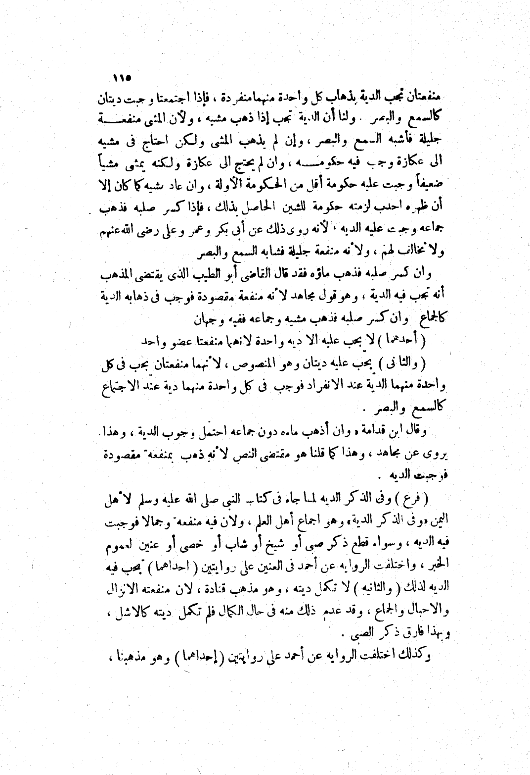ولا أن الدية تجب إذا ذهب مشيه، ولان المشى منفعة جليلة فأشبه السمع والبصر، وإن لم يذهب المشى ولكن احتاج في مشيه إلى عكازة وجب فيه حكومه، وان لم يحتج إلى عكازة ولكنه يمشى مشيا ضعيفا وجبت عليه حكومة أقل من الحكومة الاولة، وان عاد مشيه كما كان إلا أن ظهره احدب لزمته حكومة للشين الحاصل بذلك، فإذا كسر صلبه فذهب جماعه وجبت عليه الديه، لانه روى ذلك عن أبى بكر وعمر وعلى رضى الله عنهم ولا تخالف لهم، ولانه منفعة جليلة فشابه السمع والبصر وان كسر صلبه فذهب ماؤه فقد قال القاضى أبو الطيب الذى يقتضى المذهب أنه تجب فيه الدية، وهو قول مجاهد لانه منفعة مقصودة فوجب في ذهابه الدية كالجماع وان كسر صلبه فذهب مشيه وجماعه ففيه وجهان