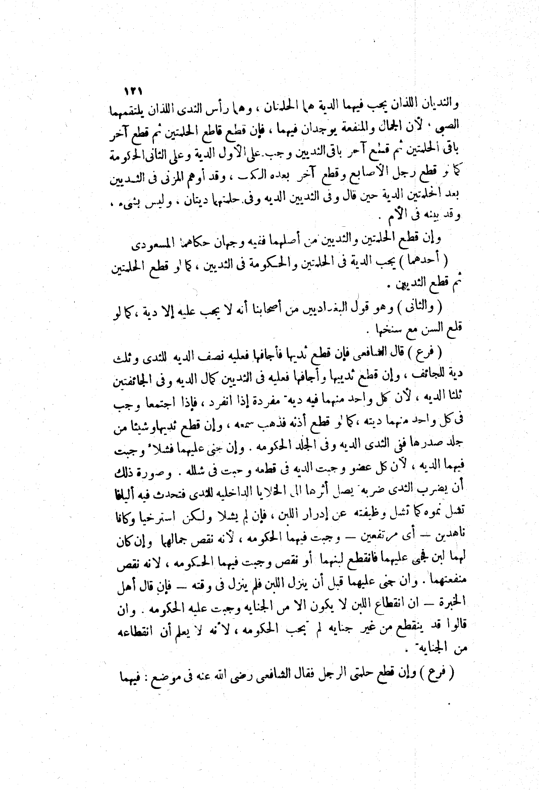 والثديان اللذان يجب فيهما لادية هما الحلمتان، وهما رأس الثدى اللذان يلتقمهما الصبى، لان الجمال والمنفعة يوجدان فيهما، فإن قطع قاطع الحلمتين ثم قطع آخر باقى الحملتين ثم قلع آخر باقى الثديين وجب على الاول الدية وعلى الثاني الحكومة كما لو قطع رجل الاصابع وقطع آخر بعده الكف، وقد أوهم المزني في الثديين بعد الحلمتين الدية حين قال وفى الثديين الديه وفى حلمتهما ديتان، وليس بشئ، وقد بينه في الام.