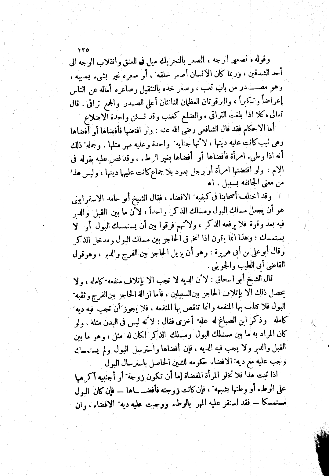 اه وقد اختلف أصحابنا في كيفية الافضاء، فقال الشيخ أبو حامد الاسفرايينى هو أن يجعل مسلك البول ومسلك الذكر واحدا، لان ما بين القبل والدبر فيه بعد وقوة فلا يرفعه الذكر، ولانهم فرقوا بين أن يستمسك البول أو لا