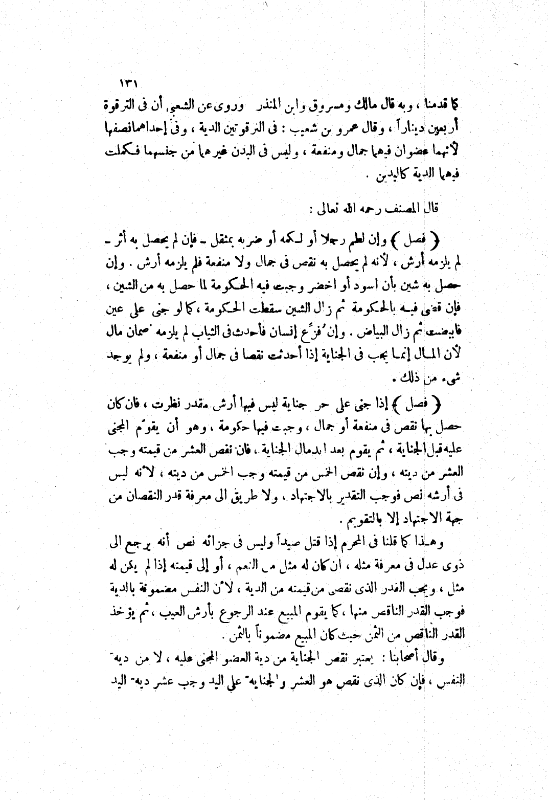 وهذا كما قلنا في المحرم إذا قتل صيدا وليس في جزائه نص أنه يرجع إلى ذوى عدل في معرفة مثله، ان كان له مثل من النعم، أو إلى قيمته إذا لم يكن له مثل، ويجب القدر الذى نقص من قيمته من الدية، لان النفس مضمونة بالدية فوجب القدر الناقص منها، كما يقوم المبيع عند الرجوع بأرش العيب، ثم يؤخذ القدر الناقص من الثمن حيث كان المبيع مضمونا بالثمن.
