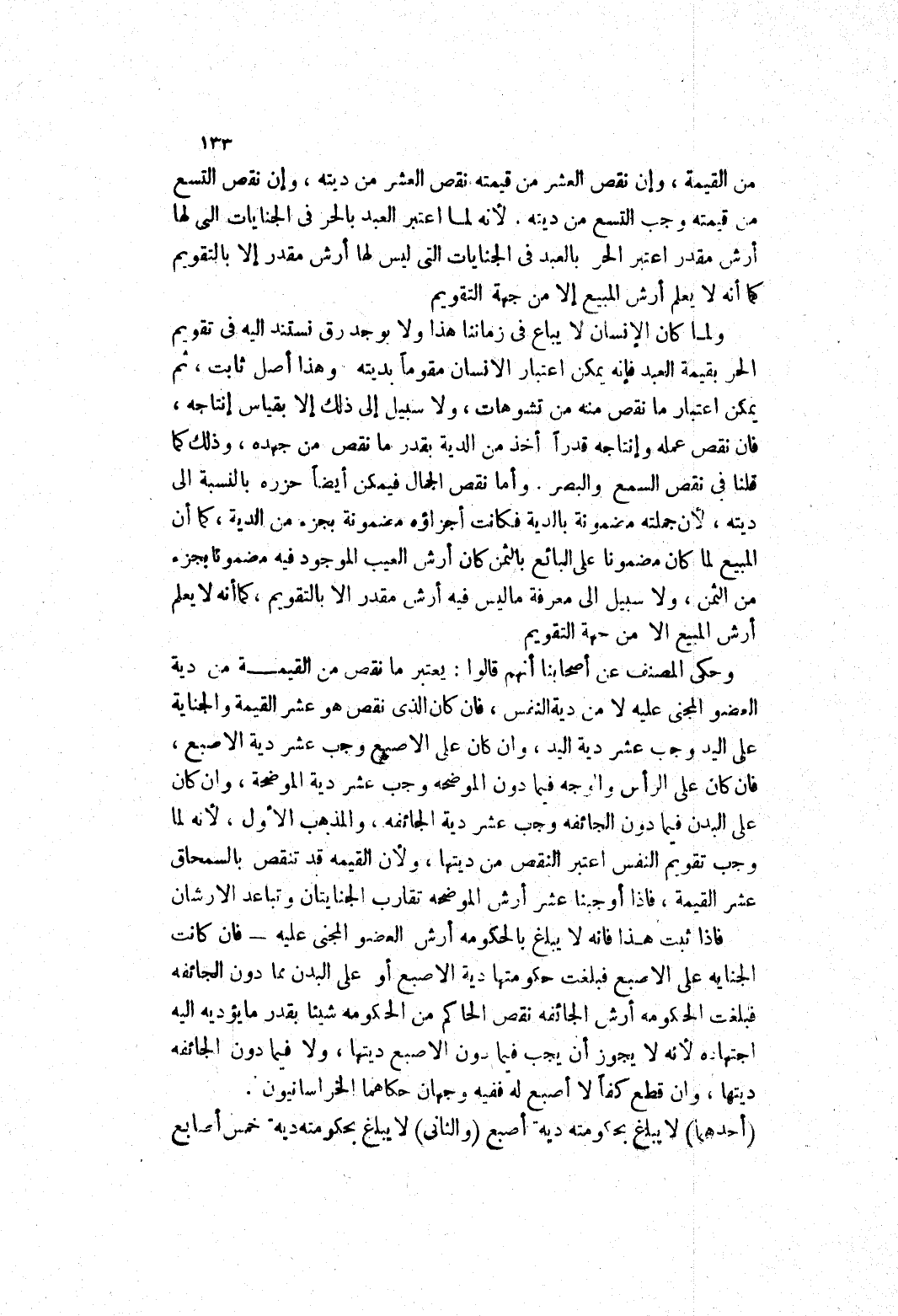 لانه لما اعتبر العبد بالحر في الجنايات التى لها أرش مقدار اعتبر الحر بالعبد في الجنايات التى ليس لها أرش مقدار إلا بالتقويم كما أنه لا يعلم أرش المبيع إلا من جهة التقويم.