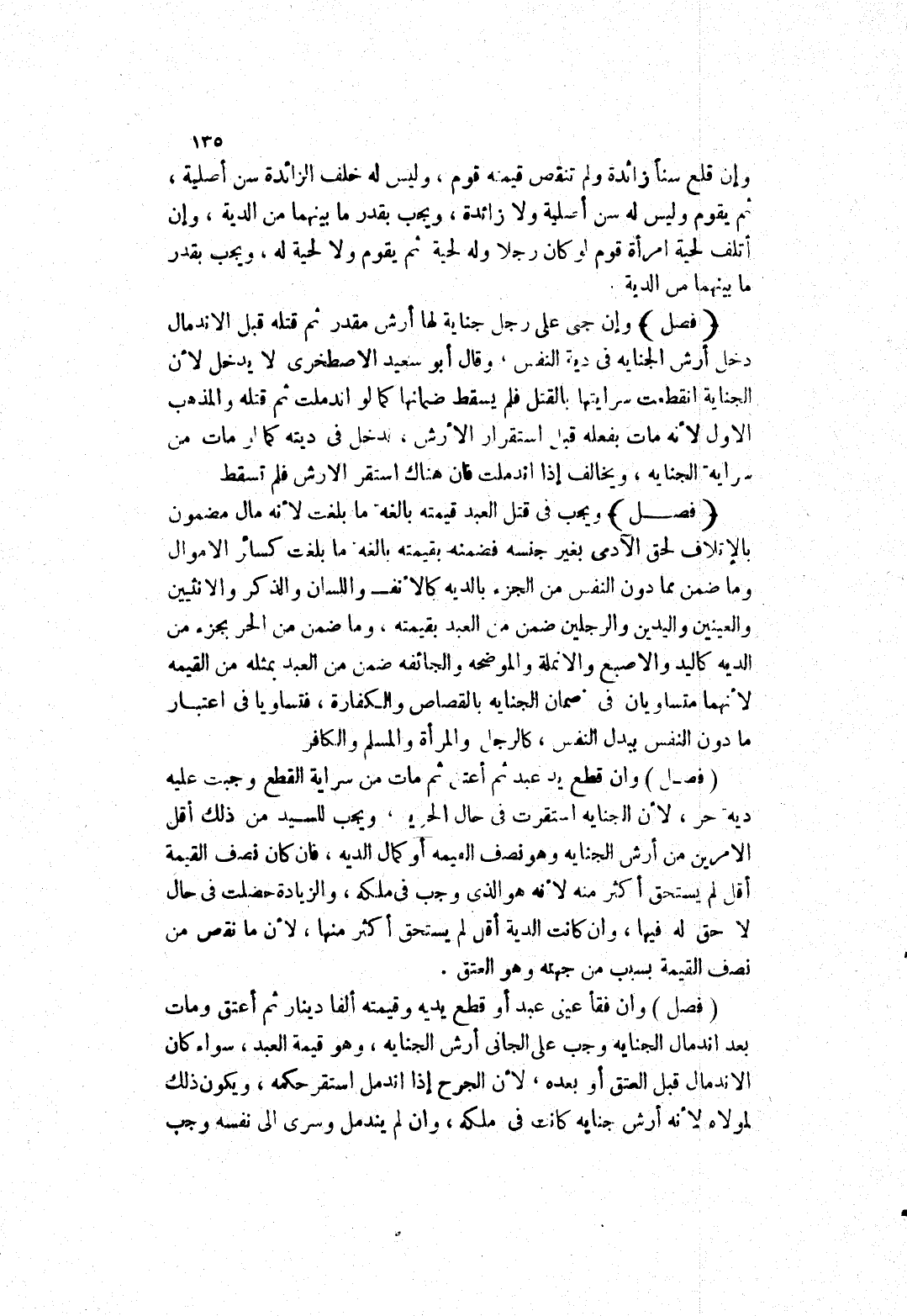 ويجب في قتل العبد قيمته بالغة ما بلغت لانه مال مضمون بالاتلاف لحق الآدمى بغير جنسه فضمنه بقيمته بالغه ما بلغت كسائر الاموال وما ضمن مما دون النفس من الجزء بالدية كالانف واللسان والذكر والانثيين والعينين واليدين والرجلين ضمن من العبد بقيمته، وما ضمن من الحر بجزء من الديه كاليد والاصبع والانملة الموضحة والجائفة ضمن من العبد بمثله من القيمه لانهما متساويان في ضمان الجناية بالقصاص والكفارة، فتساويا في اعتبار ما دون النفس ببدل النفس، كالرجل والمرأة والمسلم والكافر