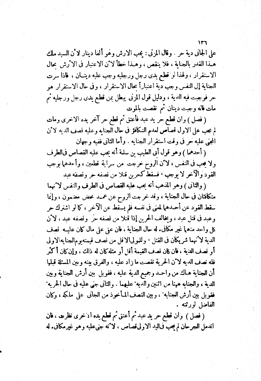 وان قطع حر يد عبد فأعتق ثم قطع حر آخر يده الاخرى ومات لم يجب على الاول قصاص لعدم التكافؤ في حال الجناية وعليه نصف الديه لان المجني عليه حرفي وقت استقرار الجنايه.