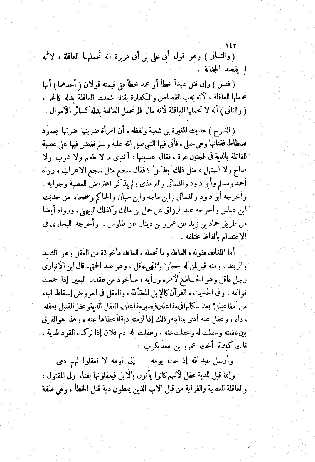 (الشرح) حديث المغيرة بن شعبة ولفظه (أن امرأة ضربتها ضربتها بعمود فسطاطا فقتلتها وهى حبلى) فأتى فيها النبي صلى الله عليه وسلم فقضى فيها على عصبة القاتلة بالدية في الجنين غرة، فقال عصبتها: أندى ما لا طعم ولا شرب ولا صاح ولا استهل، مثل ذلك يطل؟ فقال سجع مثل سجع الاعراب) رواه أحمد ومسلم وأبو داود والنسائي والترمذي ولم يذكر اعترض العصبة وجوابه.