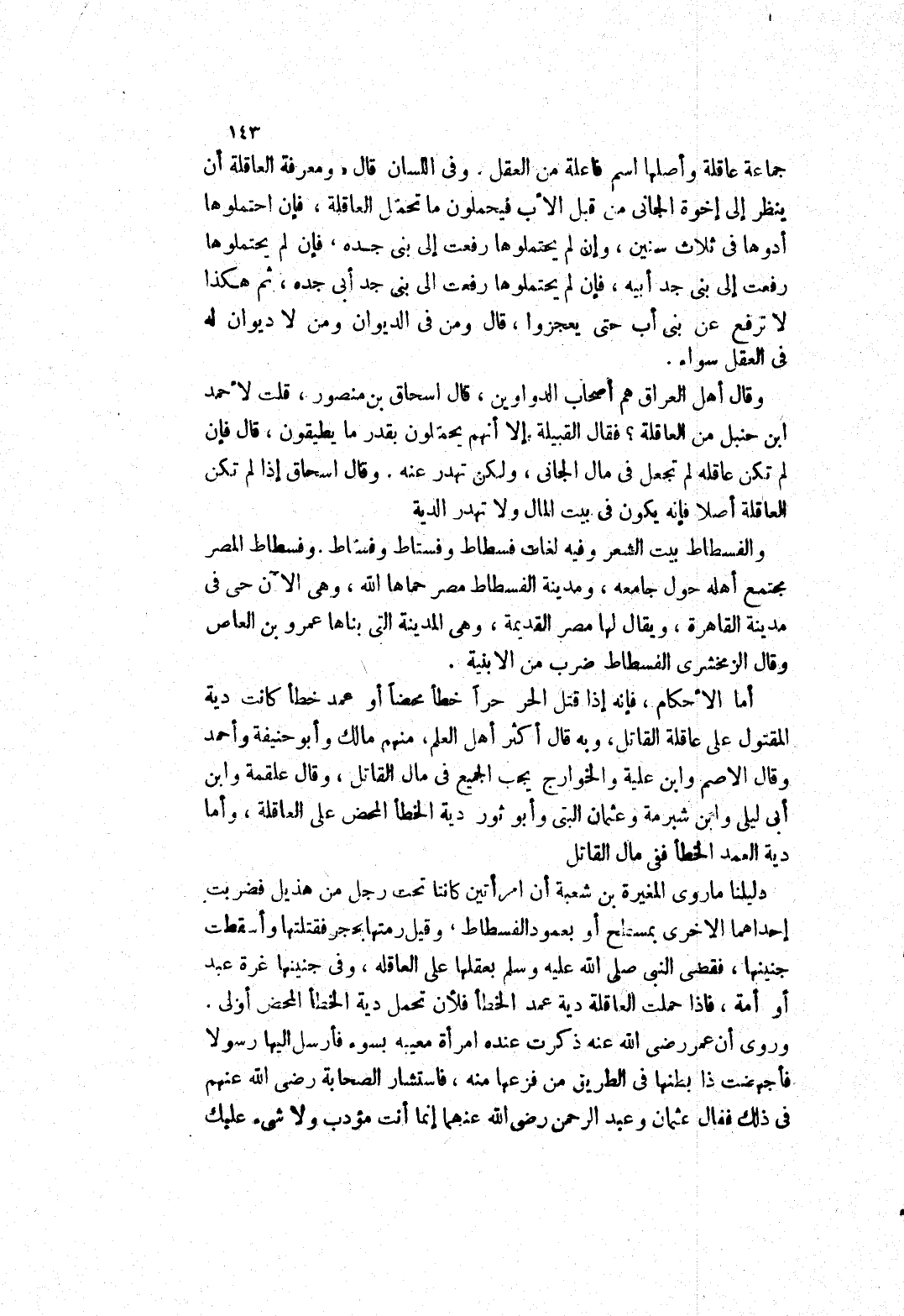 وفى اللسان قال (ومعرفة العاقلة أن ينظر إلى إخوة الجاني من قبل الاب فيحملون من تحمل العاقلة، فإن احتملوها أدوها في ثلاث سنين، وإن لم يحتملوها رفعت إلى بنى جده، فإن لم يحتملوها رفعت إلى بنى جد أبيه، فإن لم يحتملوها رفعت إلى بنى جد أبى جده، ثم هكذا لا ترفع عن بنى أب حتى يعجزوا، قال ومن في الديوان ومن لا ديوان له في العقل سواء.