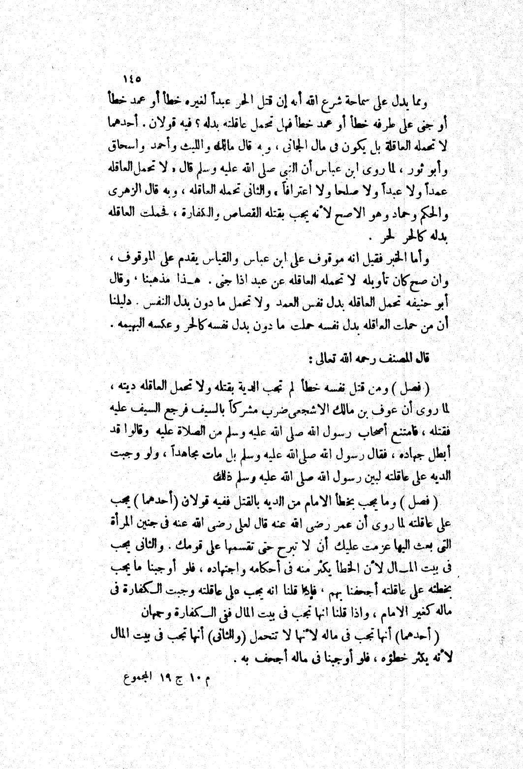 ومن قتل نفسه خطأ لم تجب الدية بقتله ولا تحمل العاقلة ديته، لما روى أن عوف بن مالك الاشجعى ضرب مشركا بالسيف فرجع السيف عليه فقتله، فامتنع أَصْحَابِ رَسُولِ اللَّهِ صَلَّى اللَّهُ عَلَيْهِ وَسَلَّمَ من الصلاة عليه وقالوا قد أبطل جهاده، فَقَالَ رَسُولُ اللَّهِ صَلَّى اللَّهُ عَلَيْهِ وَسَلَّمَ بل مات مجاهدا، ولو وجبت الديه على عاقلته لبين رسول الله صلى الله عليه وسلم ذلك