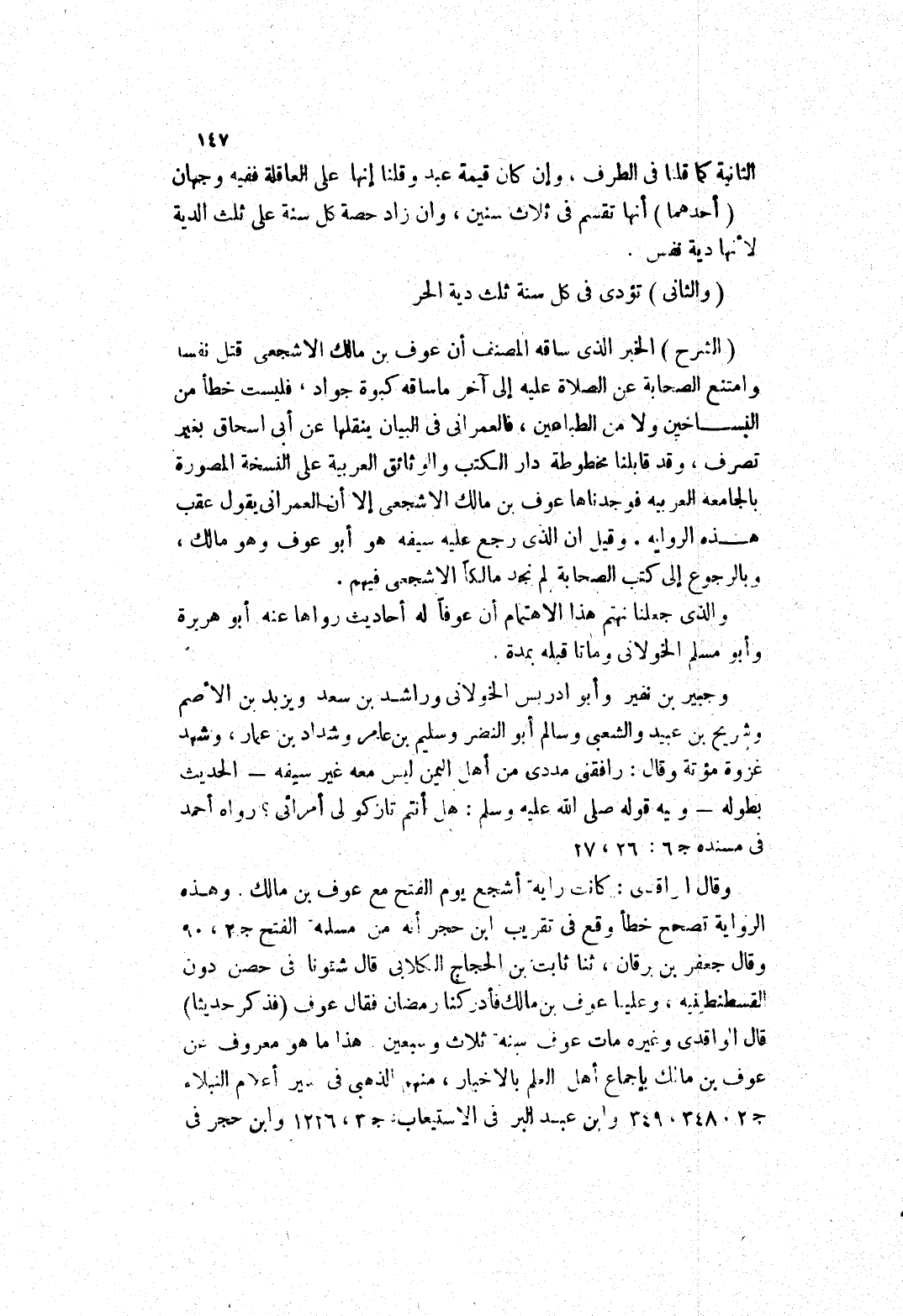 تؤدى في كل سنة ثلث دية الحر (الشرح) الخبر الذى ساقه المصنف أن عوف بن مالك الاشجعفى قتل نفسا وامتنع الصحابة عن الصلاة عليه إلى آخر ما ساقه كبوة جواد، فليست خطأ من النساخين ولا من الطباعين، فالعمراني في البيان ينقلها عن أبى اسحاق بغير تصرف، وقد قابلنا مخطوطة دار الكتب والوثائق العربية على النسخة المصورة بالجامعة العبربيه فوجدناها عوف بن مالك الاشجعى إلا أن العمرانى يقول عقب هذه الرواية.