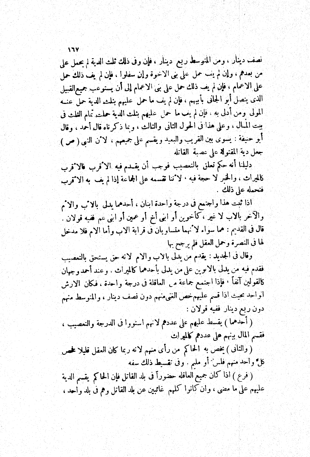 من بعدهم، وإن لم يف حمل على بنى الاخوة وإن سفلوا، فإن لم يف ذلك حمل على الاعمام، فإن لم يف ذلك حمل على بنى الاعمام إلى أن يستوعب جميع القبيل الذى يتصل أبوالجانى بأبيهم، فإن لم يف ما حمل عليهم بثلث الدية حمل عنه المولى ومن أدلى به، فإن لم يف ما حمل عليهم بثلث الدية حملت تمام الثلث في بيت المال، وعلى هذا في الحول الثاني والثالث، وبما ذكرناه قال أحمد، وقال أبو حنيفة: يسوى بين القريب البعيد ويقسم على جميعهم، لِأَنَّ النَّبِيَّ صَلَّى اللَّهُ عَلَيْهِ وَسَلَّمَ جَعَلَ دية المقتولة على عصبة القاتلة دليلنا أنه حكم تعلق بالتعصيف فوجب أن يقدم فيه الاقرب فالاقرب كالميراث، والخبر لا حجة فيه، لاننا نقسمه على الجماعة إذا لم يف به الاقرب فنحمله على ذلك.