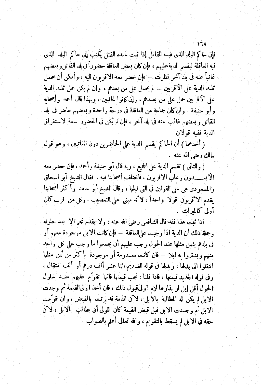 فإن حاكم البلد الذى فيه القاتل إذا ثبت عنده القتل يكتب إلى حاكم البلد الذى فيه العاقلة ليقسم الدية عليهم، فإن كان بعض العاقلة حضورا في بلد القاتل وبعضهم غائبا عنه في بلد آخر نظرت فإن حضر معه الاقربون إليه، وأمكن أن يحمل ثلث الدية على الاقربين لم يحمل على من بعدهم، وإن لم يكن حمل ثلث الدية على الالاقربين حمل على من بعدهم، وإن كانوا غائبين، وبهذا قال أحمد وأصحابه وأبو حنيفة.