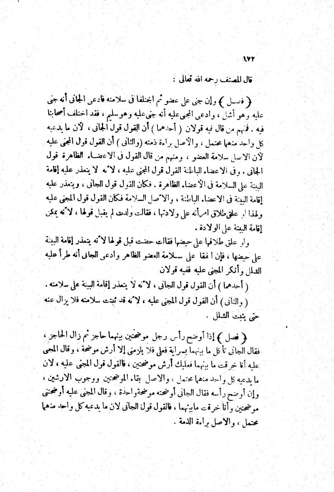 أن القول قول المجني عليه لان الاصل سلامة العضو، ومنهم من قال القول في الاعضاء الظاهرة قول الجاني، وفى الاعضاء الباطنة القول قول المجني عليه، لانه لا يتعذر عليه إقامة البينة على السلامة في الاعضاء الظاهرة، فكان القول قول الجاني، ويتعذر عليه إقامة البينة في الاعضاء الباطنة، والاصل السلامة فكان القول قول المجني عليه ولهذا لو علق طلاق امرأته على ولادتها، فقالت ولدت لم يقبل قولها، لانه يمكن إقامة البينة على الولادة.