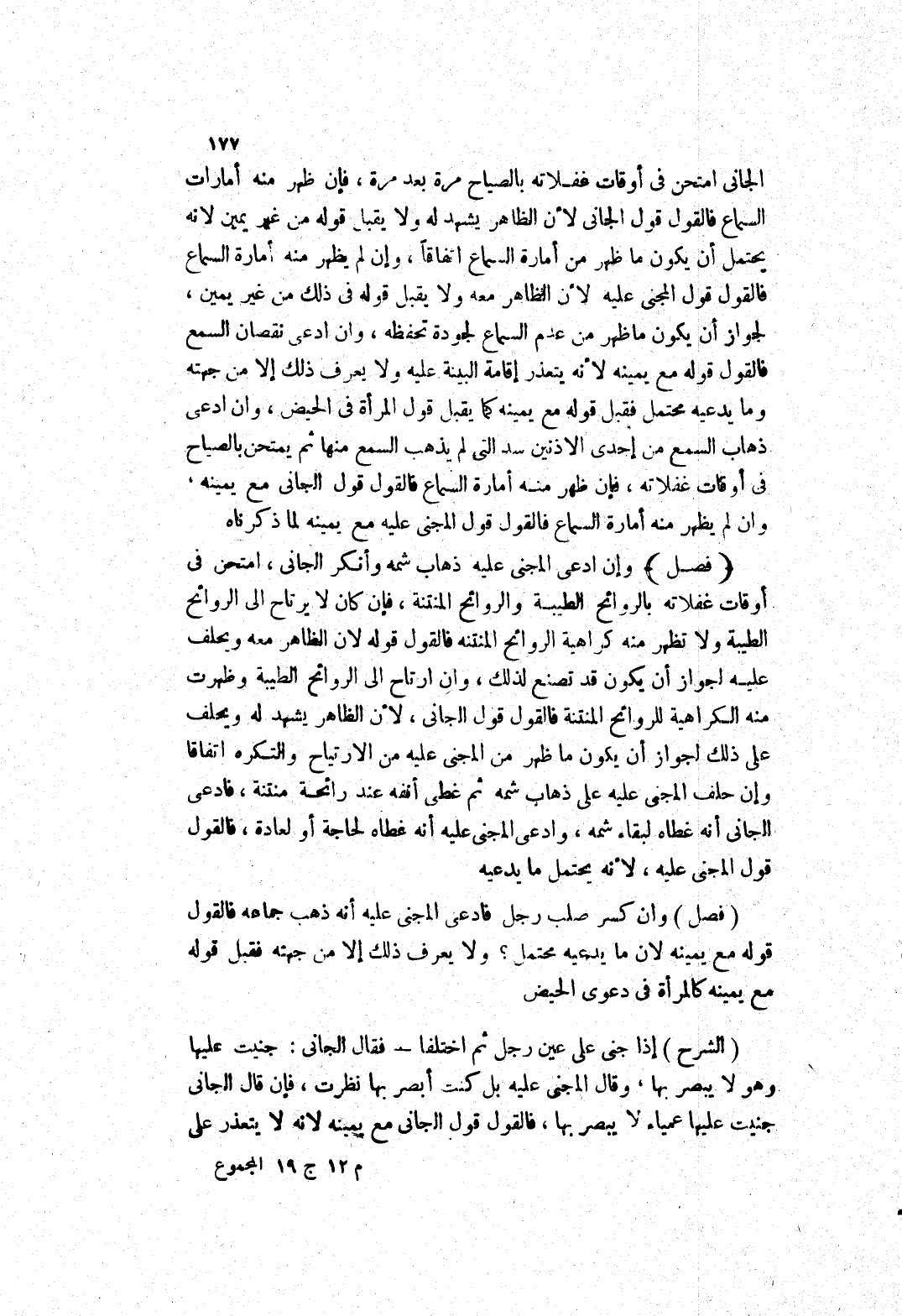 ما يدعيه محتمل فقبل قوله مع يمينه كما يقبل قول المرأة في الحيض، وان ادعى ذهاب السمع من إحدى الاذنين سد التى لم يذهب السمع منها ثم يمتحن بالصياح في أوقات غفلاته، فإن ظهر منه أمارة السمع فالقول قول الجاني مع يمينه، وان لم يظهر منه أمارة السماع فالقول قول المجني عليه مع يمينه لما ذكرناه