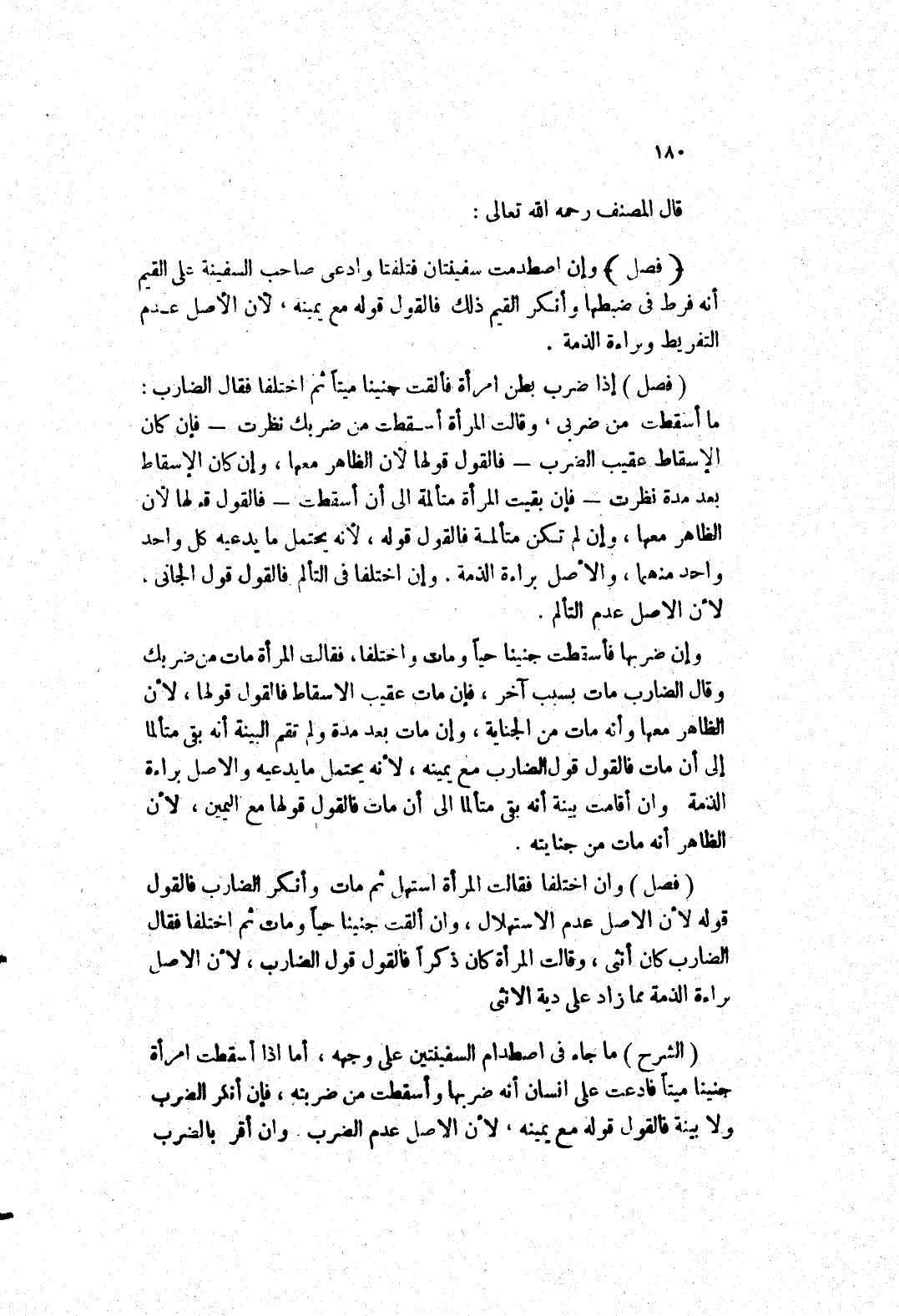 وان اختلفا فقالت المرأة استهل ثم مات وأنكر الضارب فالقول قوله لان الاصل عدم الاستهلال، وان ألقت جنينا حيا ومات ثم اختلفا فقال الضارب كا أنثى، وقالت المرأة كان ذكرا فالقول قول الضارب، لان الاصل براءة الذمة مما زاد على دية الانثى (الشرح) ما جاء في اصطدم السفينتين على وجهه، أما إذا أسقطت امرأة جنينا ميتا فادعت على انسان أنه ضربها وأسقطت من ضربته، فإن أنكر الضرب ولابينة فالقول قوله مع يمينه، لان الاصل عدم الضرب، وان أقر بالضرب