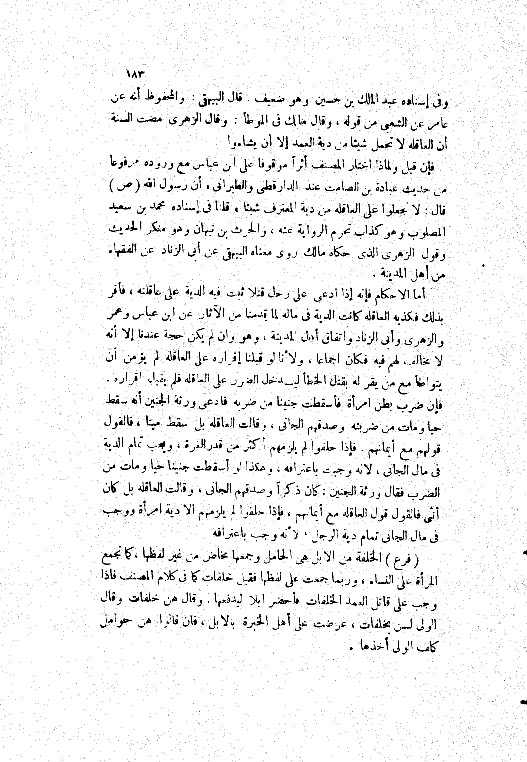 قال: لا تجعلوا على العاقلة من دية المعترف شيئا) قلنا في إسناده محمد بن سعيد المصلوب وهو كذاب تحرم الرواية عنه، والحرث بن نبهان وهو منكر الحديث وقول الزهري الذى حكاه مالك روى معناه البيهقى عن أبى الزناد عن الفقهاء من أهل المدينة.