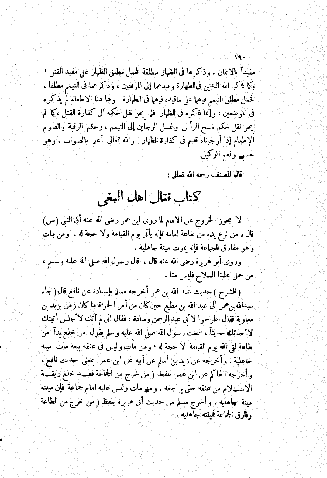 كتاب قتال اهل البغى لا يجوز الخروج عن الامام لما روى ابْنِ عُمَرُ رَضِيَ اللَّهُ عَنْهُ أَنَّ النَّبِيَّ صَلَّى اللَّهُ عليه وسلم قال (من نزع يده من طاعة امامه فإنه يأتي يوم القيامة ولا حجة له.