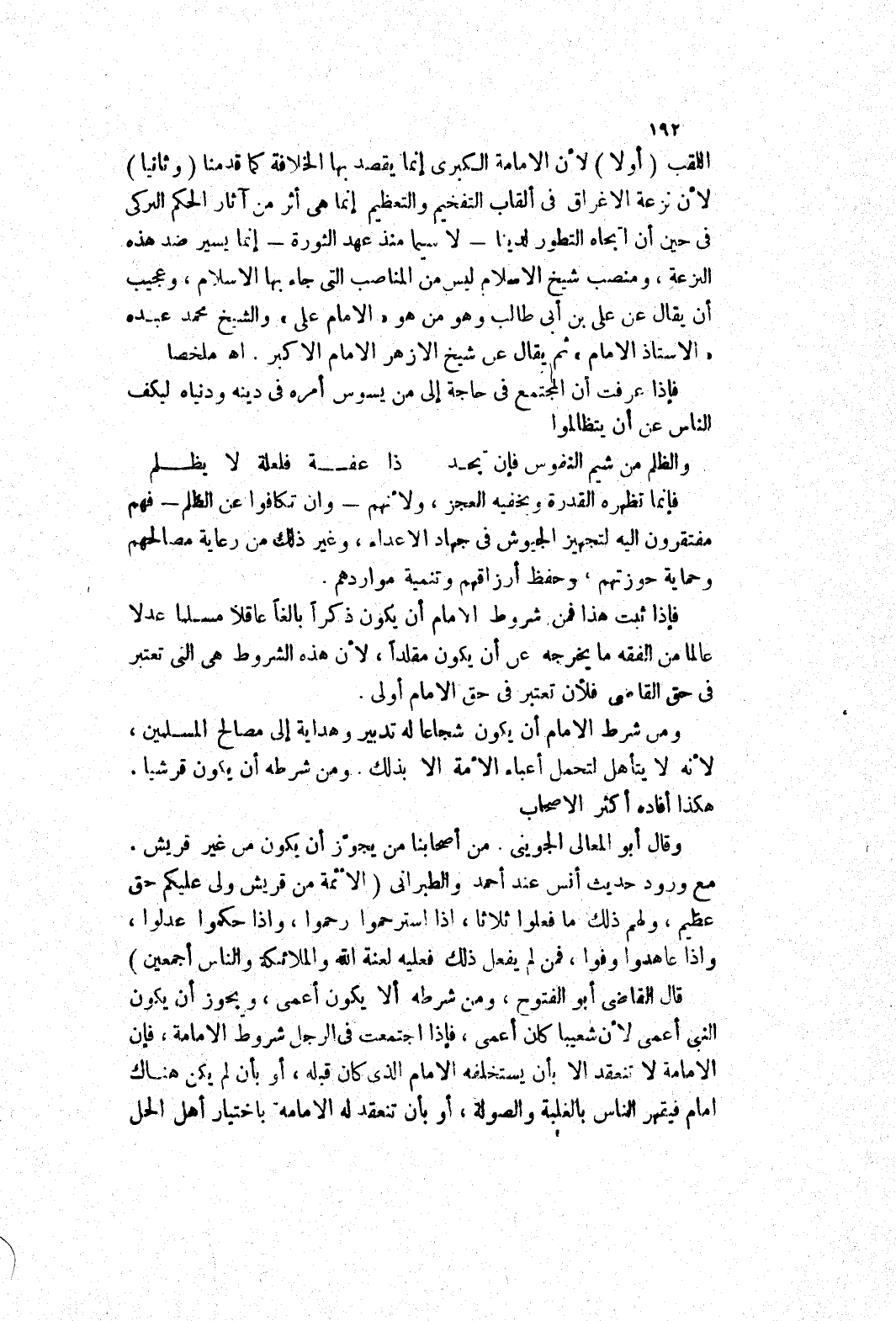 اللقب (أولا) لان الامامة الكبرى إنما يقصد بها الخلافة كما قدمنا (وثانيا) لان نزعة الاغراق في ألقاب التفخيم والتعظيم إنما هي أثر من آثار الحكم التركي في حين أن اتجاه التطور لدنيا لاسيما منذ عهد الثورة إنما يسير ضد هذه النزعة، ومنصف شيخ الاسلام ليس من المناصب التى جاء بها الاسلام، وعجيب أن يقال عن على بن أبى طالب وهو من هو (الامام على) والشيخ محمد عبده (الاستاذ الامام) ثم يقال عن شيخ الازهر الامام الاكبر.