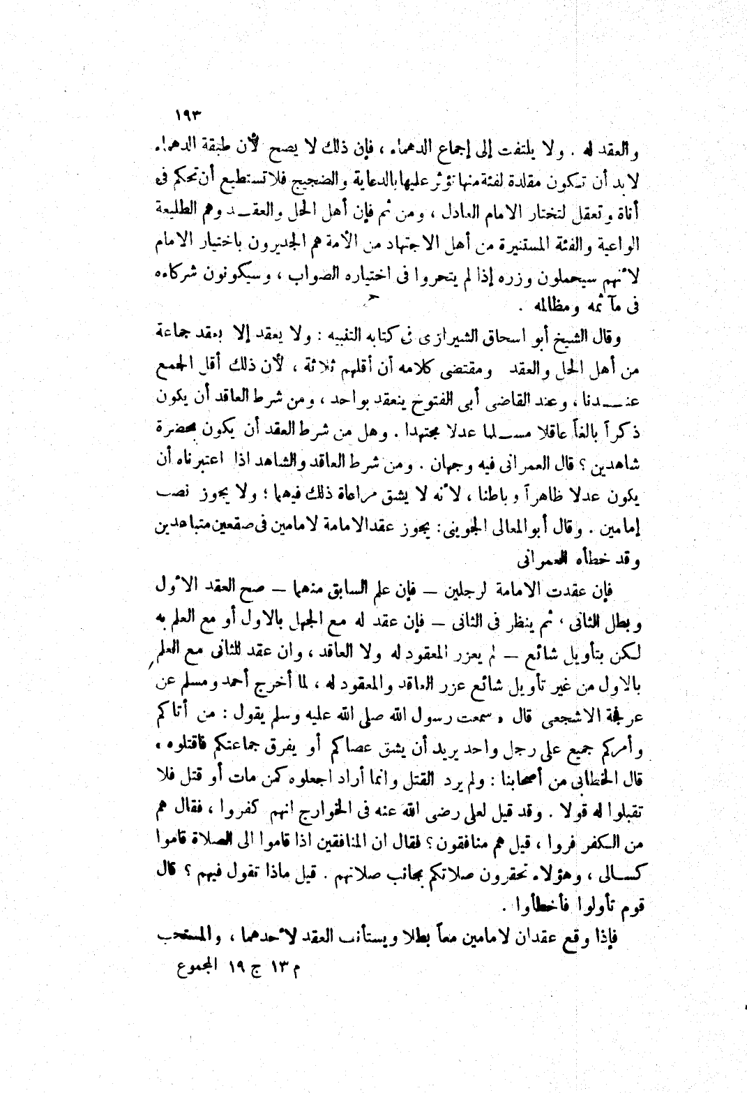 ولا يلتفت إلى إجماع الدهماء، فإن ذلك لا يصح لان طبقة الدهماء لابد أن تكون مقلدة لفئة منها تؤثر عليها بالدعاية والضجيج فلا تستطيع أن تحكم في أناة وتعقل لتختار الامام العادل، ومن ثم فإن أهل الحل والعقد وهم الطليعة الواعية والفئة المستنيرة من أهل الاجتهاد من الامة هم الجديرون باختيار الامام لانهم سيحملون وزره إذا لم يتحروا في اختياره الصواب، وسيكونون شركاءه