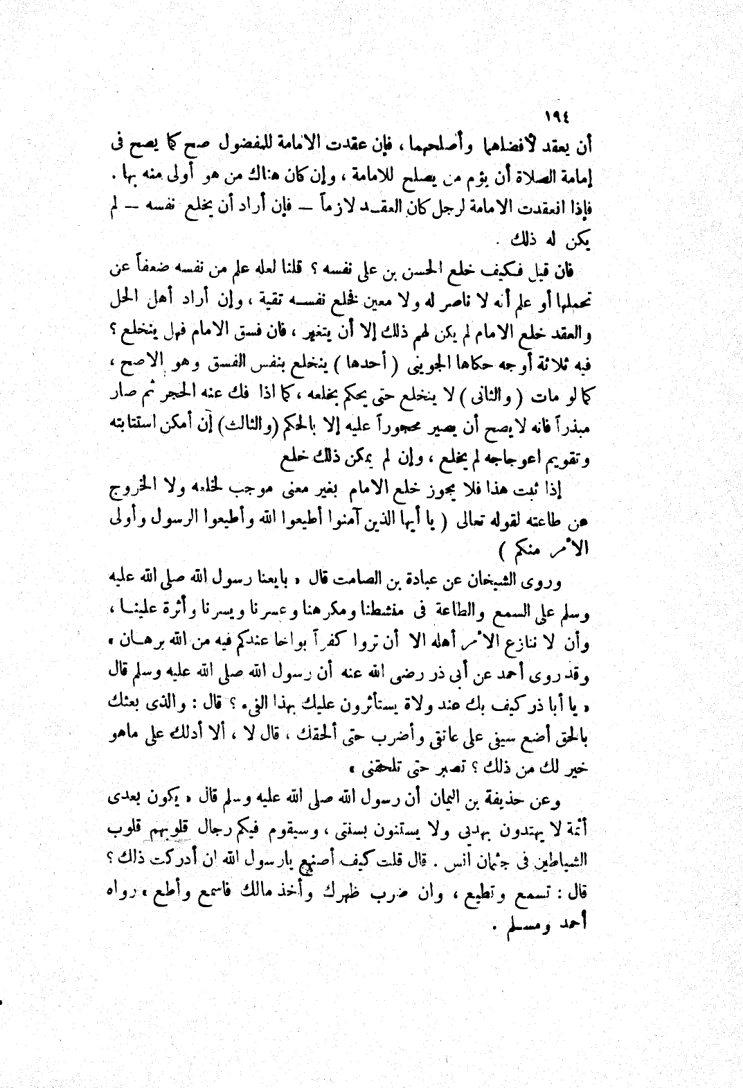 لا ينخلع حتى يحكم بخلعه، كما إذا فك عنه الحجر ثم صار مبذرا فانه لا يصح أن يصير محجورا عليه إلا بالحكم (والثالث) إن امكن استتابته وتقويم اعوجاجه لم يخلع، وإن لم يمكن ذلك خلع إذا ثبت هذا فلا يجوز خلع الامام بغير معنى موجب لخلعه ولا الخروج عن طاعته لقوله تعالى (يا أيها الذين آمنوا أطيعوا الله وأطيعوا الرسول وأولى الامر منكم) وروى الشيخان عن عبادة بن الصامت قال ((بايعنا رَسُولِ اللَّهِ صَلَّى اللَّهُ عَلَيْهِ وَسَلَّمَ عَلَى السمع والطاعة في منشطنا ومكرهنا وعسرنا ويسرنا وأثرة علينا، وأن لا ننازع الامر أهله الا أن تروا كفرا بواخا عندكم فيه من الله برهان) وقد روى أحمد عن أَبِي ذَرٍّ رَضِيَ اللَّهُ عَنْهُ أَنَّ رَسُولَ اللَّهِ صَلَّى اللَّهُ عَلَيْهِ وَسَلَّمَ قَالَ (يَا أبا ذر كيف بك عند ولاة يستأثرون عليك بهذا الفئ؟ قال: والذى بعثك بالحق أضع سيفى على عاتقي وأضرب حتى ألحقك، قال لا، ألا أدلك على ما هو خير لك من ذلك؟ تصبر حتى تلحقني) وعن حذيفة بن اليمان أَنَّ رَسُولَ اللَّهِ صَلَّى اللَّهُ عَلَيْهِ وَسَلَّمَ قال (يكون بعدى