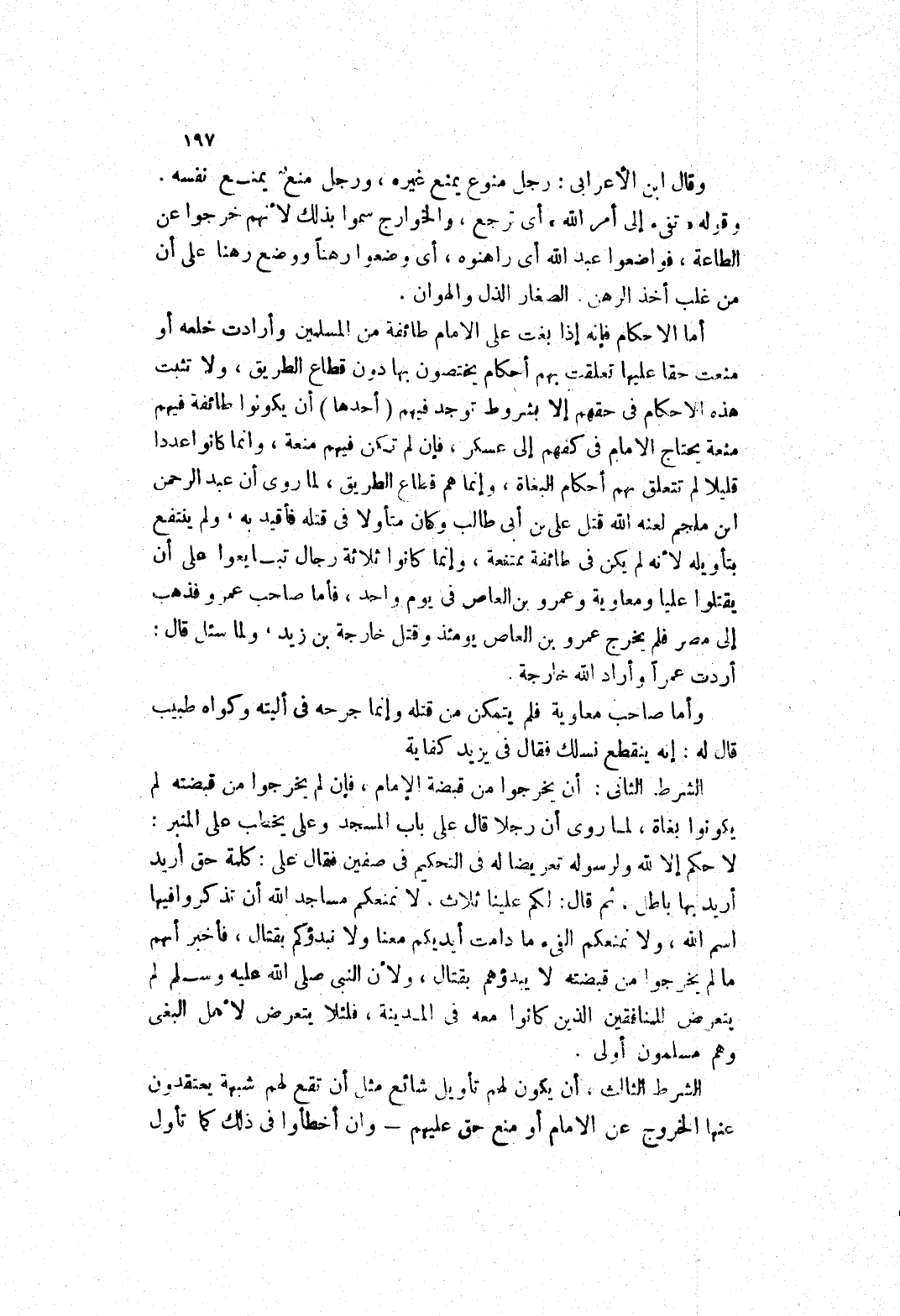 أما الاحكام فإنه إذا بغت على الامام طائفة من المسلمين وأرادت خلعه أو منعت حقا عليها تعلقت بهم أحكام يختصون بها دون قطاع الطريق، ولا تثبت هذه الاحكام في حقهم إلا بشروط توجد فيهم (أحدها) أن يكونوا طائفة فيهم منعة يحتاج الامام في كفهم إلى عسكر، فإن لم تكن فيهم منعة، وانما كانوا عددا قليلا لم تتعلق بهم أحكام البغاة، وإنما هم قطاع الطريق، لما روى أن عبد الرحمن