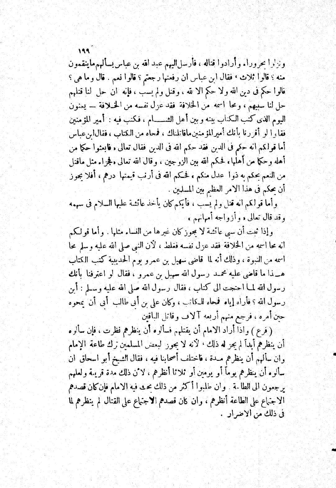 وأما قولكم أنه قتل ولم يسب، فأيكم كان يأخذ عائشة عليها السلام في سهمه وقد قال تعالى (وازواجه أمهاتهم) وإذا ثبت أن سبى عائشة لا يجوز كان غيرها من النساء مثلها وأما قولكم انه محا اسمه من الخلافة فقد عزل نفسه فغلط، لان النبي صلى الله عليه وسلم محا اسمه من النبوة، وذلك أنه لما قاضى سهيل بن عمرو يم الحديبية كتب الكتاب هذا ما قاضي عليه محمد رسول الله سهيل بن عمرو، فقال لو اعترفنا بأنك رسول الله لما احتجت إلى كتاب، فَقَالَ رَسُولُ اللَّهِ صَلَّى اللَّهُ عَلَيْهِ وَسَلَّمَ: أين رسول الله؟ فأراه إياه فمحاه للكاتب، وكان على بن أبى طالب أبى أن يمحوه حين أمره، فرجع منهم أربعة آلاف وقاتل الباقين (فرع)