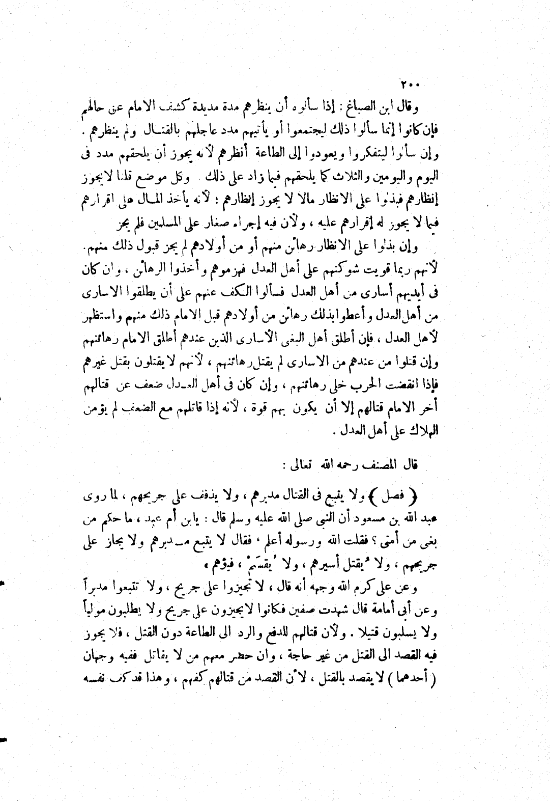 ولا يتبع في القتال مدبرهم، ولا يذفف على جريحهم، لِمَا رَوَى عَبْدِ اللَّهِ بْنِ مَسْعُودٍ إنَّ النَّبِيَّ صَلَّى اللَّهُ عَلَيْهِ وَسَلَّمَ قَالَ: يابن أم عبد، ما حكم من بغى من أمتى؟ فقلت الله ورسوله أعلم، فقال لا يتبع مدبرهم ولايجاز على جريحهم، ولا يقتل أسيرهم ولا يقسم، فيؤهم) .