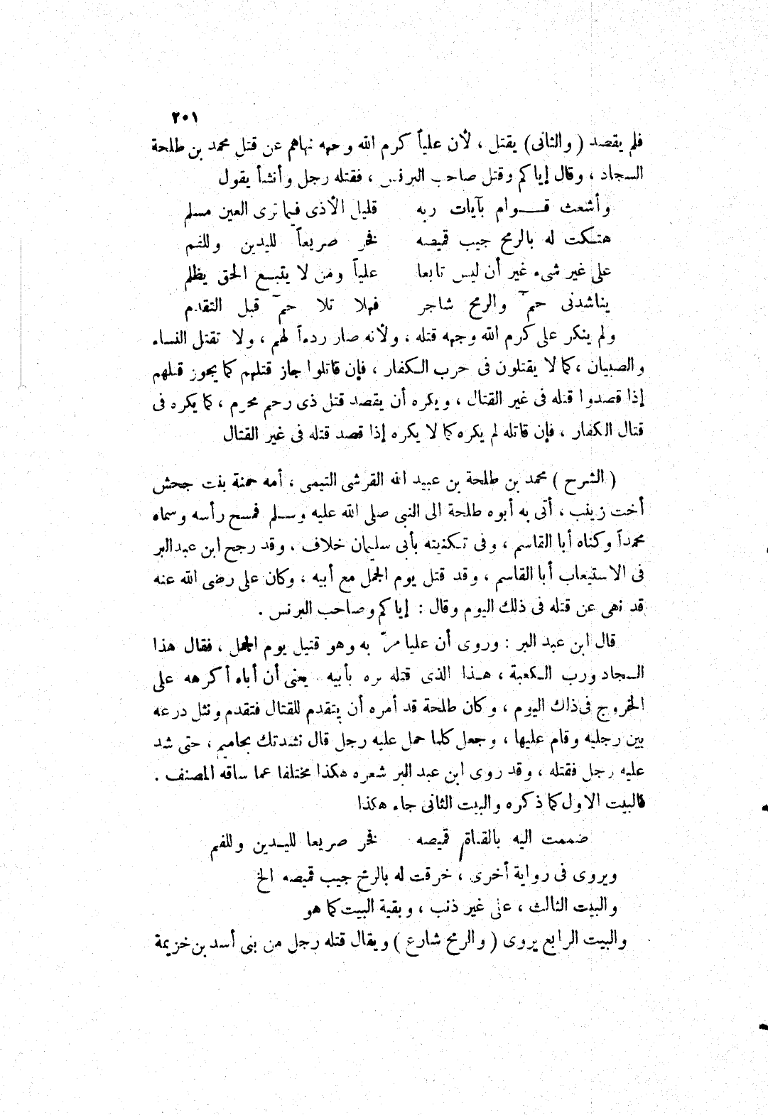 * فهلا تلا حم قبل التقدم ولم ينكر على كرم الله وجهه قتله، ولانه صار ردءا لهم، ولا تقتل النساء والصبيان، كما لا يقتلون في حرب الكفار، فإن قاتلوا جاز قتلهم كما يجوز قتلهم إذا قصدوا قتله في غير القتال، ويكره أن يقصد قتل ذى رحم محرم، كما يكره في قتال كفار، فإن قاتله لم يكره كما لا يكره إذا قصد قتله في غير القتال (الشرح) محمد بن طلحة بن عبيد الله القرشى التيمى، أمه حمنة بنت جحش أخت زينب، أتى به أبوه طَلْحَةَ إلَى النَّبِيِّ صَلَّى اللَّهُ عَلَيْهِ وَسَلَّمَ فَمَسَحَ رَأْسَهُ وسماه