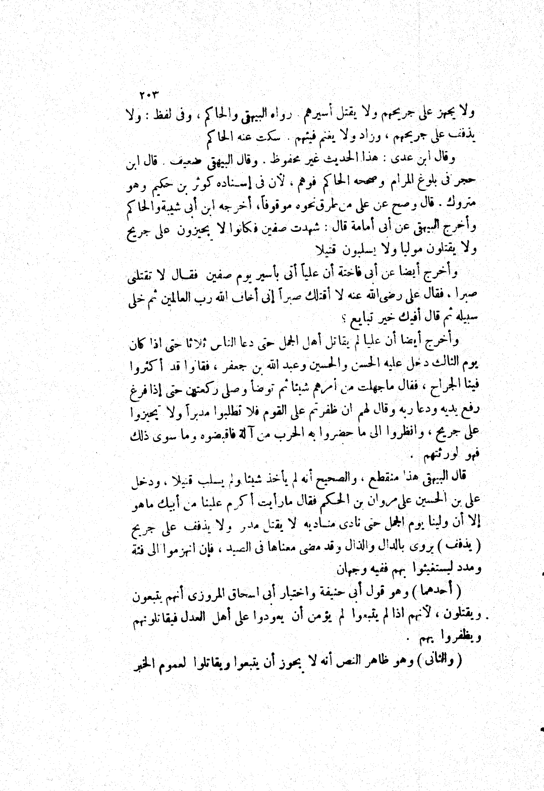 قال وصح عن على من طرق نحوه موقوفا، أخرجه ابن أبى شيبة والحاكم وأخرج البيهقى عن أبى أمامة قال: شهدت صفين فكانوا لا يجيزون على جريح ولا يقتلون موليا ولا يسلبون قتيلا وأخرج أيضا عن أبى فاختة أن عليا أتى بأسير يوم صفين فقال لا تقتلني صبرا، فقال على رضى الله عنه لا أقتلك صبرا إنى أخاف الله رب العالمين ثم خلى سبيله ثم قال أفيك خير تبايع؟ وأخرج أيضا أن عليا لم يقاتل أهل الجمل حتى دعا الناس ثلاثا حتى إذا كان يوم الثالث دخل عليه الحسن والحسين وعبد الله بن جعفر، فقالوا قد أكثروا فينا الجراح، فقال ما جهلت من أمرهم شيئا ثم توضأ وصلى ركعتين حتى إذا فرغ رفع يديه ودعا ربه وقال لهم ان ظفرتم على القوم فلا تطلبوا مدبرا ولا تجيزوا على جريح، وانظروا إلى ما حضروا به الحرب من آلة فاقبضوه وما سوى ذلك فهو لورثتهم.