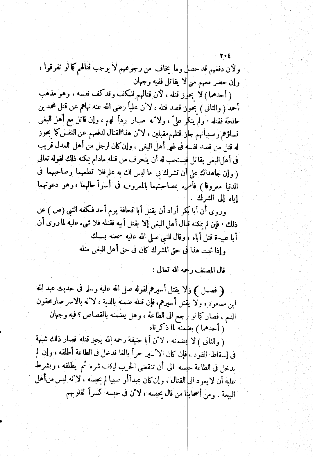 ولا يقتل أسيرهم لِقَوْلِهِ صَلَّى اللَّهُ عَلَيْهِ وَسَلَّمَ فِي حَدِيثِ عبد الله ابن مسعود (ولا يقتل أسيرهم) فإن قتله ضمنه بالدية، لانه بالاسر صار محقون الدم، فصار كما لو رجع إلى الطاعة، وهل يضمنه بالقصاص؟ فيه وجهان