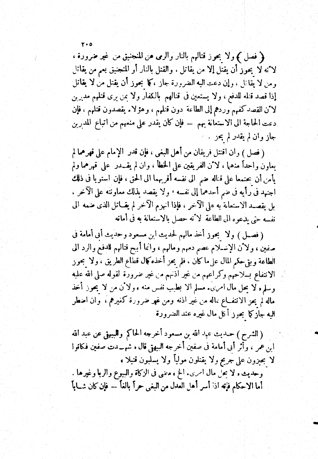 وسلم (لَا يَحِلُّ مَالُ امْرِئٍ مُسْلِمٍ إلَّا بِطِيبِ نفس منه) ولان من لا يجوز أخذ ماله لم يجز الانتفاع بماله من غير اذنه ومن غير ضرورة كغيرهم، وان اضطر إليه جاز كما يجوز أكل مال غيره عند الضرورة (الشرح) حديث عبد الله بن مسعود أخرجه الحاكم والبيهقي عن عبد الله ابن عمر، وأثر أبى أمامة في صفين أخرجه البيهقى قال (شهدت صفين فكاءوا لا يجيزون على جريح ولا يقتلون موليا ولا يسلبون قتيلا) وحديث (لا يحل ما امرى الخ) مضى في الزكاة والبيوع والربا وغيرها أما الاحكام فانه إذا أسر أهل العدل من البغى حرا بالغا فإن كان شابا