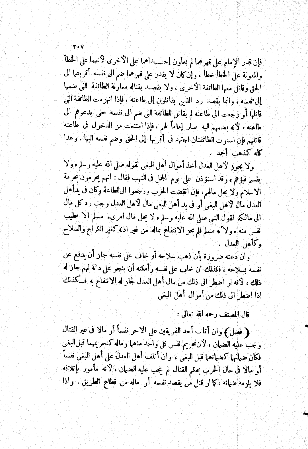وان أتلف أحد الفريقين على الاخر نفسا أو مالا في غير القتال وجب عليه الضمان، لان تحريم نفس كل واحد منهما وماله كتحريمهما قبل البغى فكان ضمانهما كضمانهما قبل البغى، وان أتلف أهل العدل على أهل البغى نفسا أو مالا في حال الحرب بحكم القتال لم يجب عليه الضمان، لانه مأمور بإتلافه فلا يلزمه ضمانه، كما لو قتل من يقصد نفسه أو ماله من قطاع الطريق.