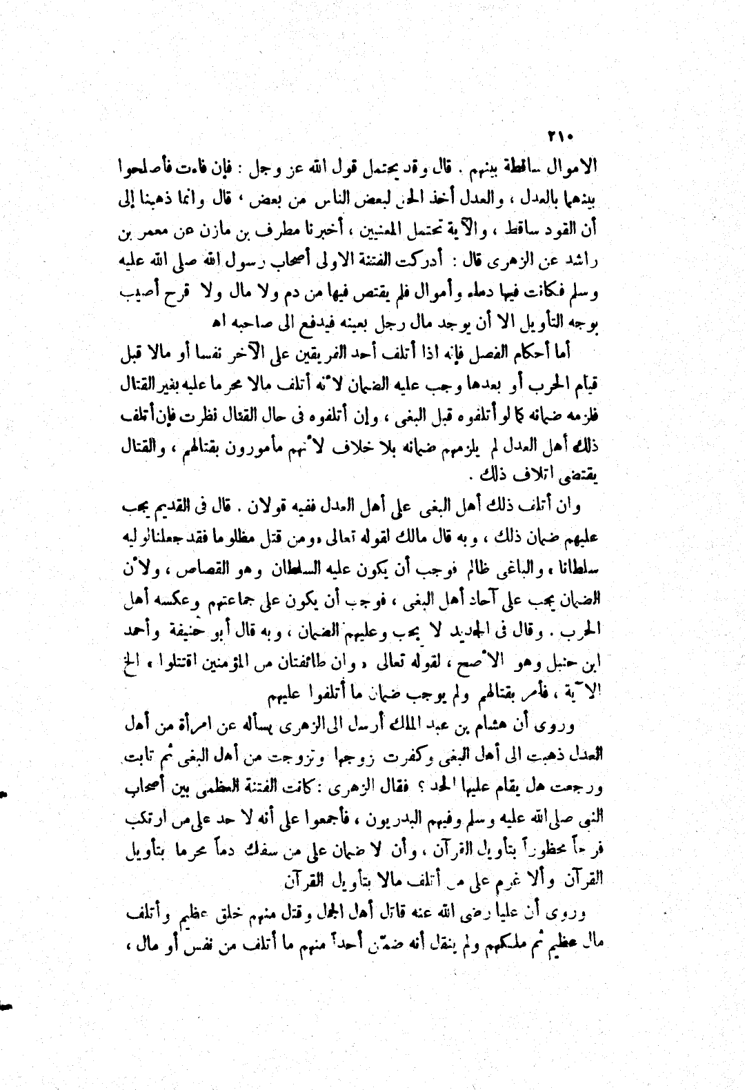 وروى أن هشام بن عبد الملك أرسل إلى الزهري يسأله عن امرأة من أهل العد ذهبت إلى أهل البغى وكفرت زوجها وتزوجت من أهل البغى ثم تابت ورجعت هل يقام عليها الحد؟ فقال الزهري: كانت الفتنة العظمى بين أصحاب النبي صلى الله عليه وسلم وفيهم البدريون، فأجمعوا على أنه لا حد على من ارتكب فرحا محظورا يتأويل القرآن، وأن لا ضمان على من سفك دما محرما بتأويل القرآن وألا غرم على من أتلف مالا بتأويل القرآن وروى أن عليا رضى الله عنه قاتل أهل الجمل وقتل منهم خلق عظيم وأتلف مال عظيم ثم ملكهم ولم ينقل أنه ضمن أحدا منهم ما أتلف من نفس أو مال،