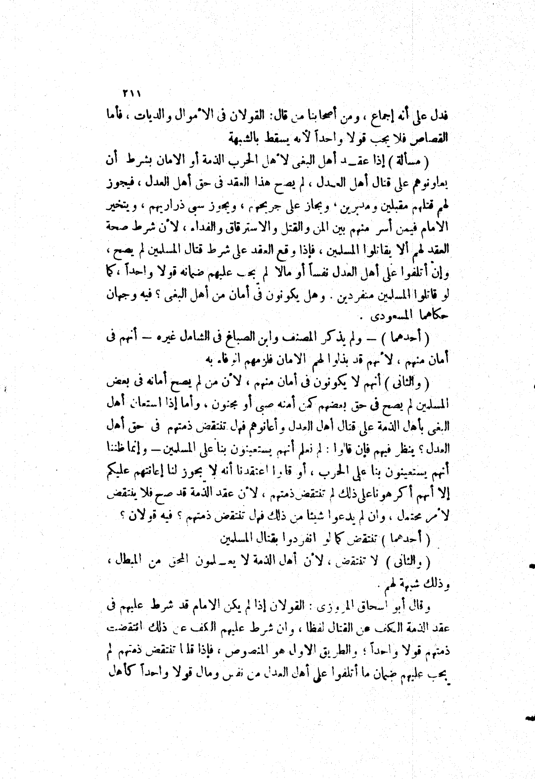 فدل على أنه إجماع، ومن أصحابنا من قال: القولان في الاموال والديات، فأما القصاص فلا يجب قولا واحدا لانه يسقط بالشبهة (مسألة) إذا عقد أهل البغى لاهل الحرب الذمة أو الامان بشرط أن يعاونهم على قتال أهل العدل، لم يصح هذا العقد في حق أهل العدل، فيجوز لهم قتلهم مقبلين ومدبرين، ويجاز على جريحهم، ويجوز سبى ذراريهم، ويتخير الامام فيمن أسر منهم بين المن والقتل والاسترقاق والفداء، لان شرط صحة العقد لهم ألا يقاتلوا المسلمين، فإذا وقع القد على شرط قتال المسلمين لم يصح، وإن أتلفوا على أهل العدل نفسا أو مالا لم يجب عليهم ضمانه قولا واحدا، كما لو قاتلوا المسلمين منفردين.