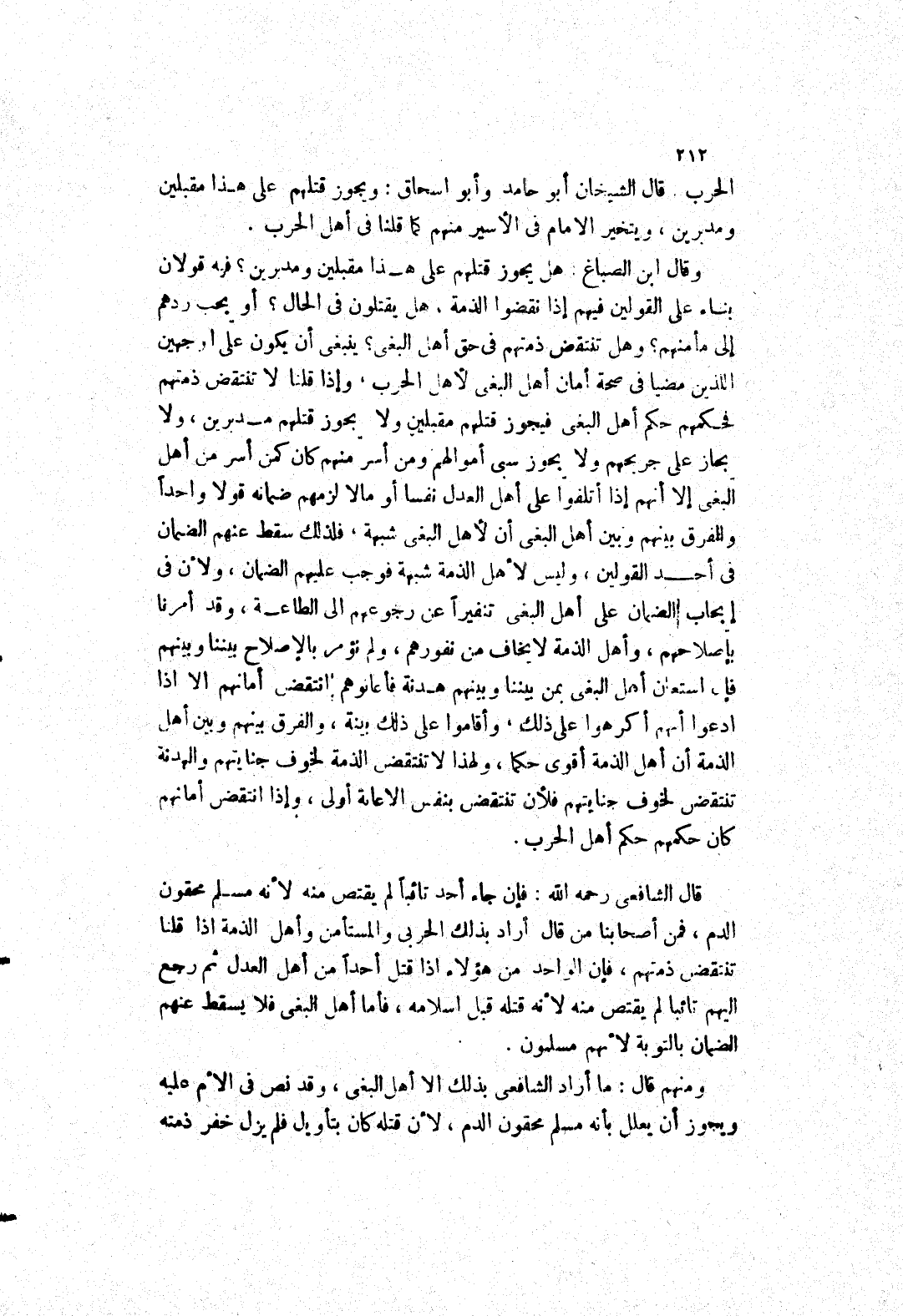 ومنهم قال: ما أراد الشافعي بذلك الا أهل البغى، وقد نص في الام عليه ويجوز أن يعلل بأنه مسلم محقون الدم، لان قتله كان بتأويل فلم يزل خفر ذمته