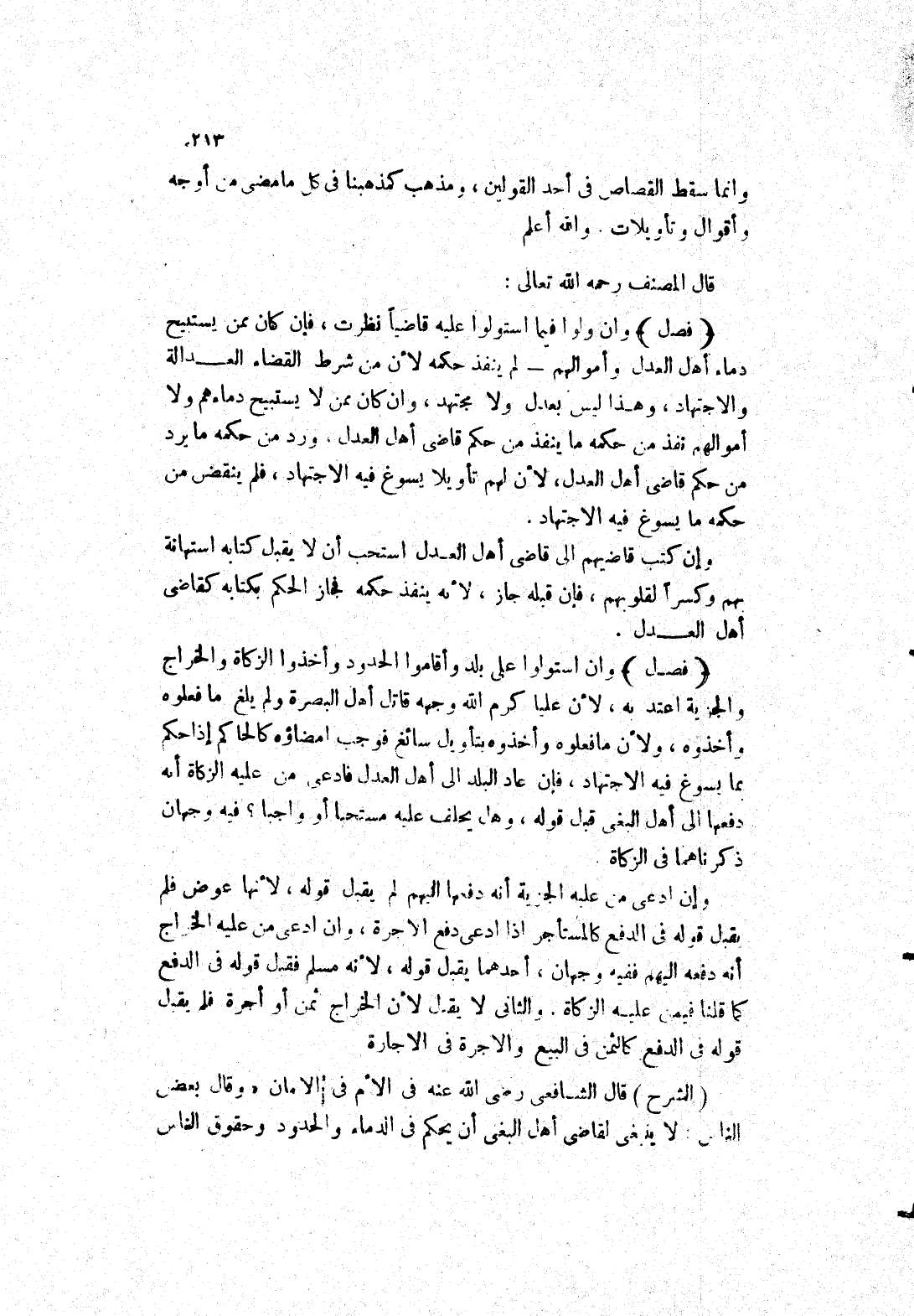 وإن ادعى من عليه الجزية أنه دفعها إليهم لم يقبل قوله، لانها عوض فلم يقبل قوله في الدفع كالمستأجر إذا ادعى دفع الاجرة، وان ادعى من عليه الخراج أنه دفعه إليهم ففيه وجهان، أحدهما يقبل قوله، لانه مسلم فقبل قوله في الدفع كما قلنا فيمن عليه الزكاة، والثانى لا يقبل لان الخراج ثمن أو أجرة فلم يقبل قوله في الدفع كالثمن في البيع والاجرة في الاجارة (الشَّرْحُ) قَالَ الشَّافِعِيُّ رَضِيَ اللَّهُ عَنْهُ فِي الْأُمِّ في الامان (وقال بعض الناس: لا ينبغى لقاضي أهل البغى أن يحكم في الدماء والحدود وحقوق الناس