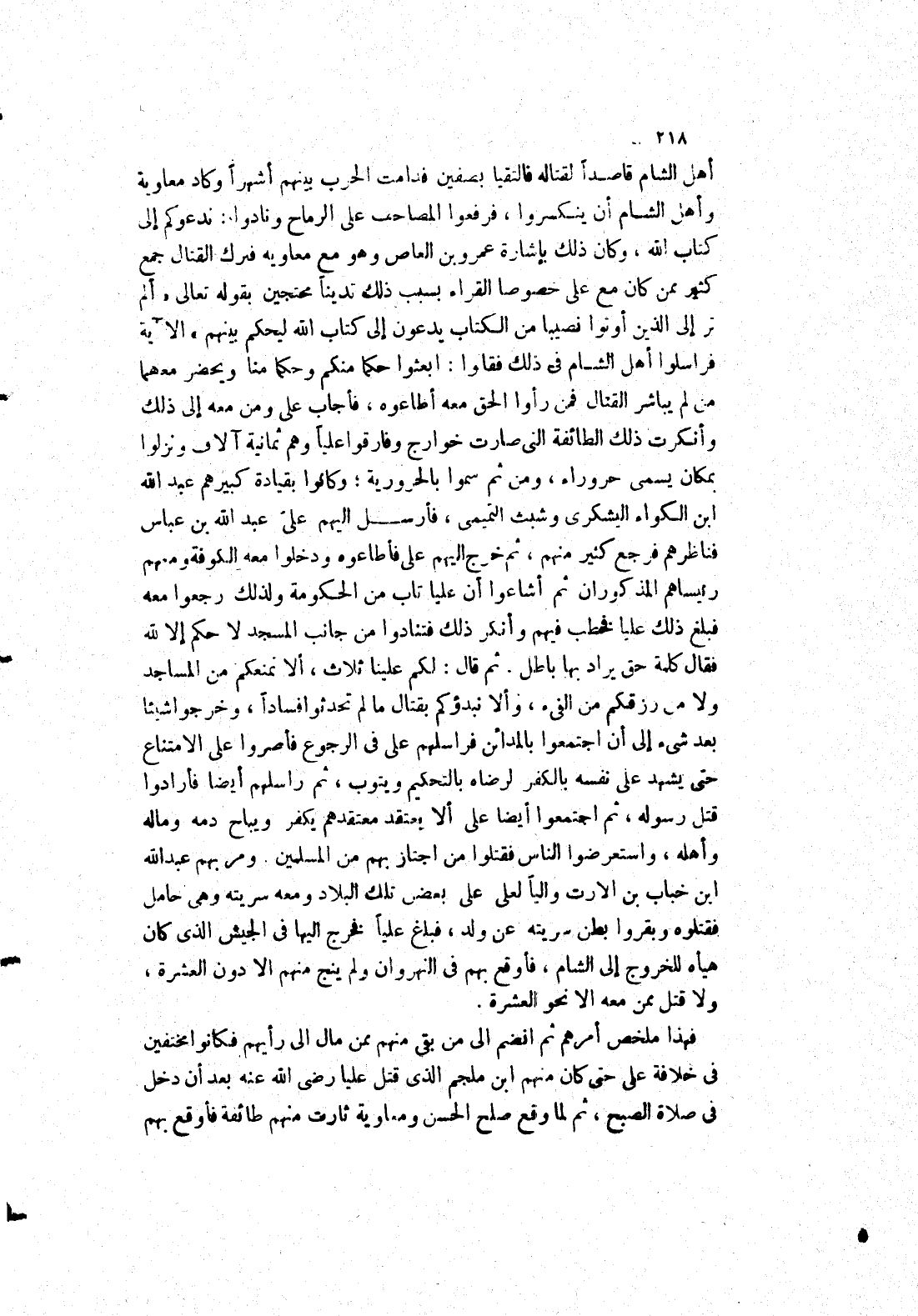 ثم قال: لكم علينا ثلاث، ألا نمنعكم من المساجد ولامن رزقكم من الفئ، وألا نبدؤكم بقتال ما لم تحدثوا فسادا، وخرجوا شيئا بعد شئ إلى أن اجتمعوا بالمدائن فراسلهم على في الرجوع فأصروا على الامتناع حتى يشهد على نفسه بالكفر لرضاه بالتحكيم ويتوب، ثم راسلهم أيضا فأرادوا قتل رسوله، ثم اجتمعوا أيضا على ألا يعتقد معتقدهم يكفر ويباح دمه وماله وأهله، واستعرضوا الناس فقتلوا من اجتاز بهم من المسلمين ومربهم عبد الله ابن خباب بن الارت واليا لعلى على بعض تلك البلاد ومعه سريته وهى حامل فقتلوه وبقروا بطن سريته عن ولد، فبلغ عليا فحرج إليها في الجيش الذى كان هيأه للخروج إلى الشام، فأوقع بهم في النهروان ولم ينج منهم الا دون العشرة، ولا قتل ممن معه الا نحو العشرة.