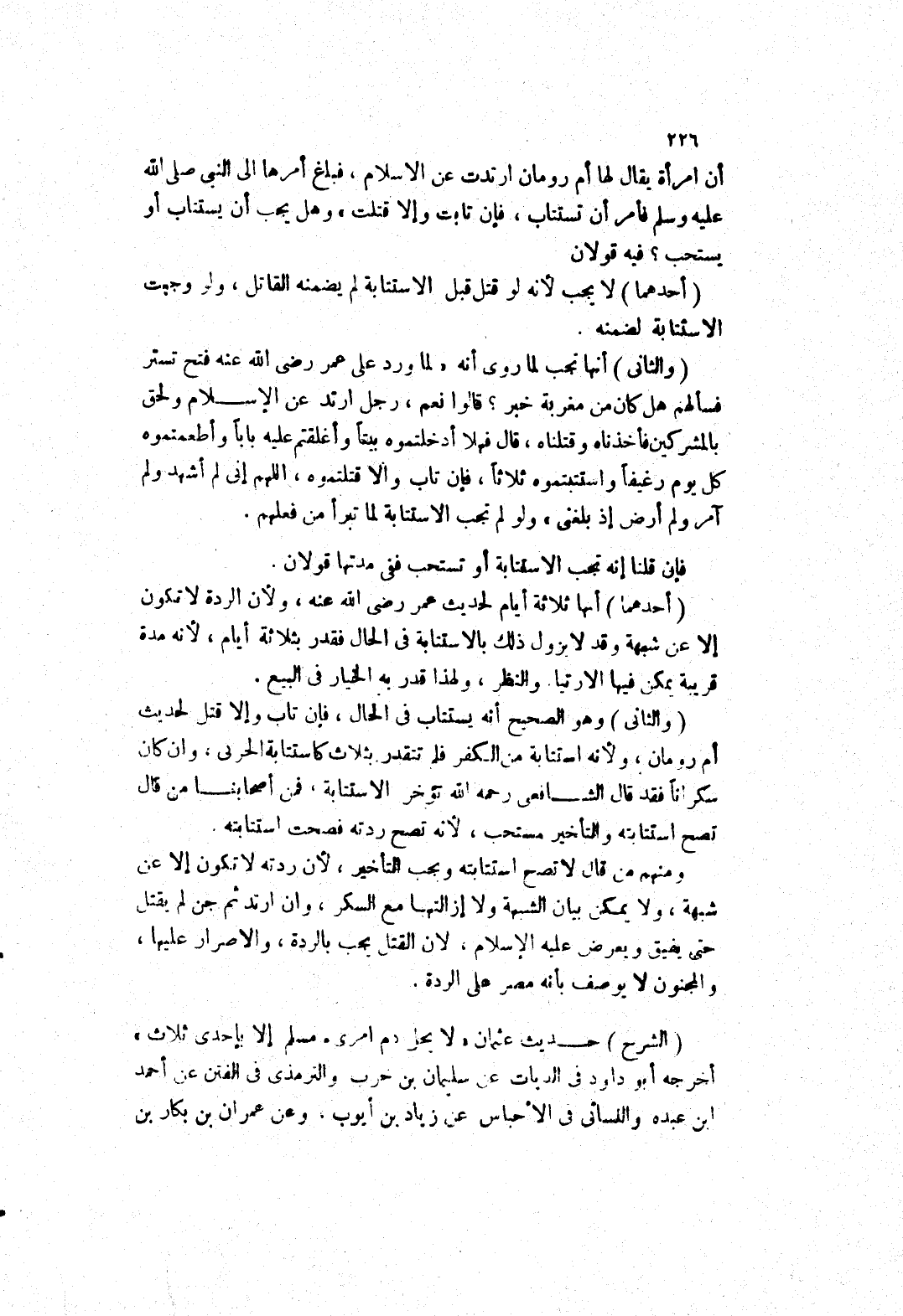 أن امرأة يقال لها أم رومان ارتدت عن الاسلام، فبلغ أمرها إلى النبي صلى الله عليه وسلم فأمر أن تستناب، فإن تابت وإلا قتلت) وهل يجب أن يستناب أو يستحب؟ فيه قولان